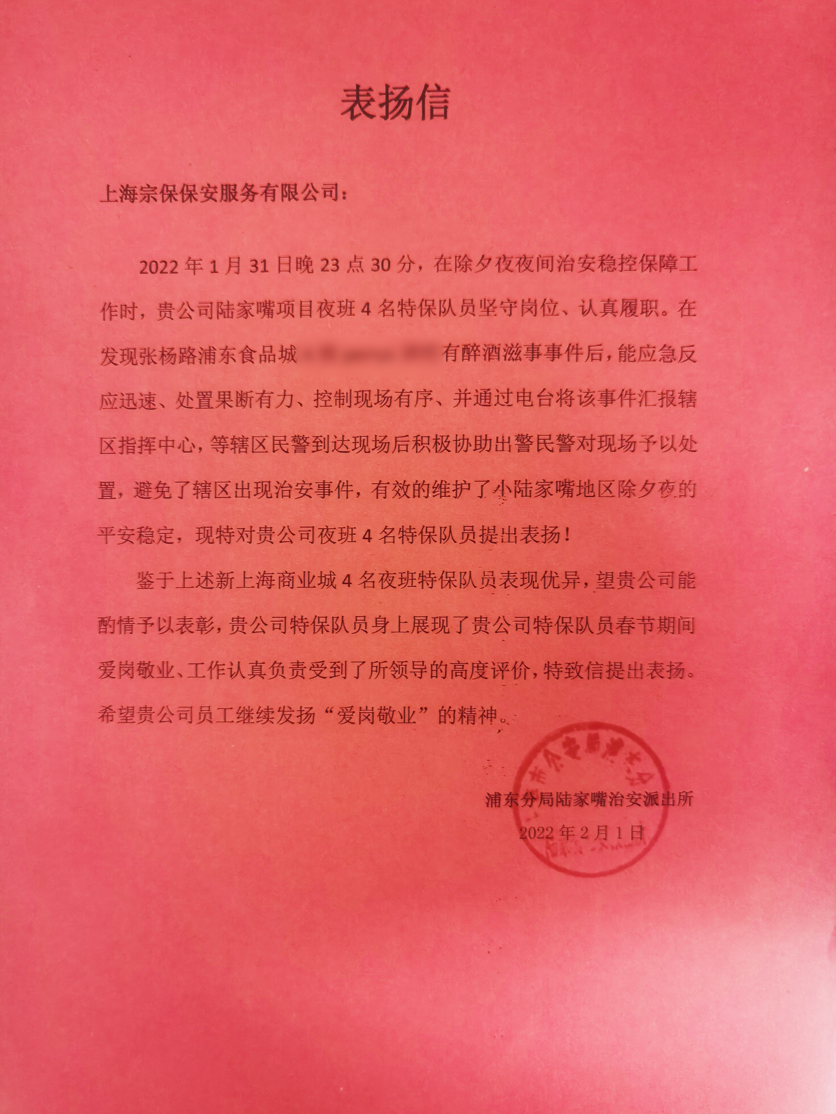 2月1日,宗保公司駐陸家嘴綜合管理項(xiàng)目收到浦東分局陸家嘴治安派出所的一封表揚(yáng)信,信中表揚(yáng)了宗保隊(duì)員得當(dāng)處置醉酒男子滋事的行為。