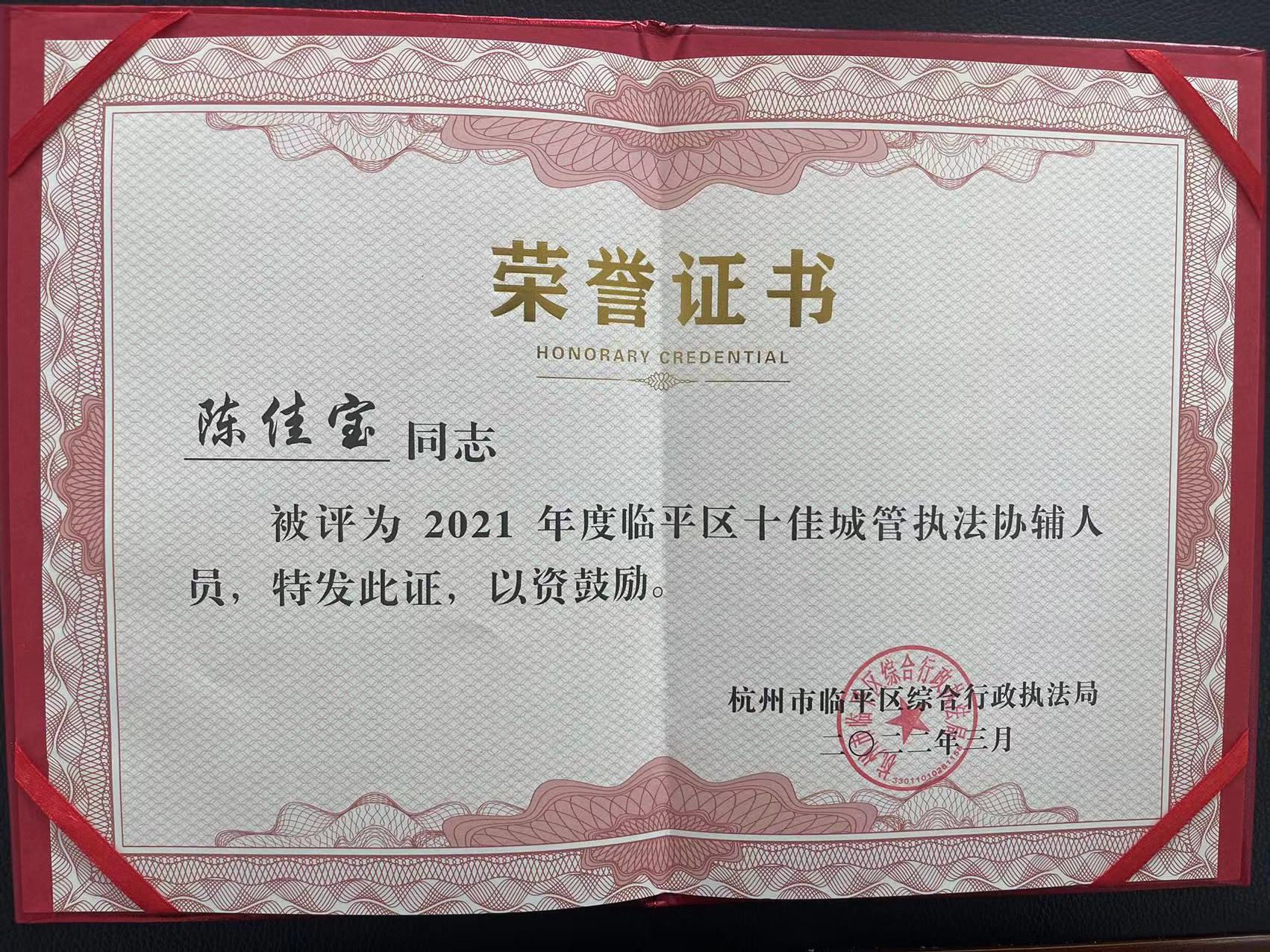 3月9日,杭州市臨平區(qū)星橋街道城管中隊(duì)領(lǐng)導(dǎo)將一本榮譽(yù)證書送到浙江民泰隊(duì)員陳佳寶的手中,祝賀他榮獲“2021年度臨平區(qū)十佳城管執(zhí)法輔助人員”。