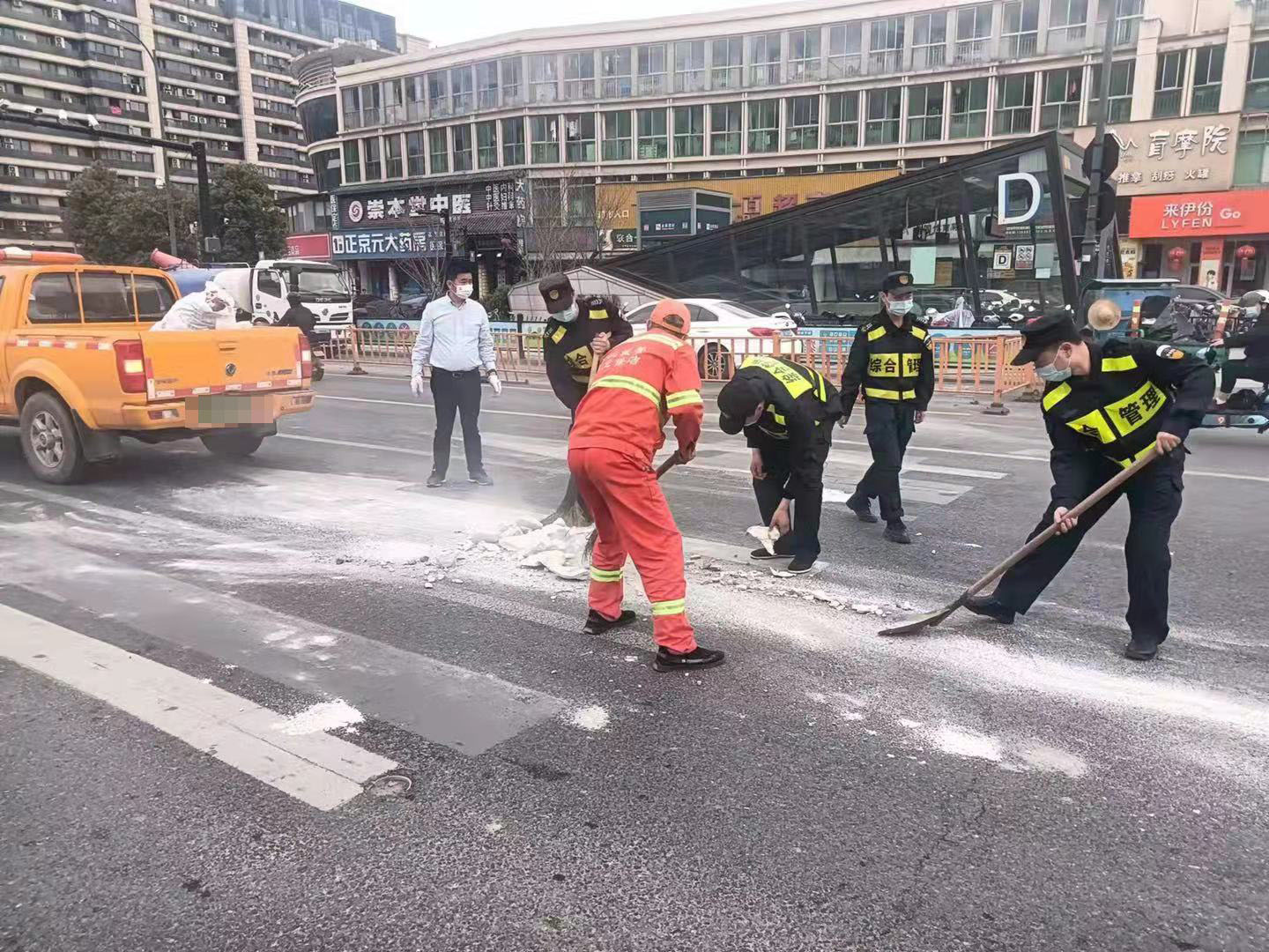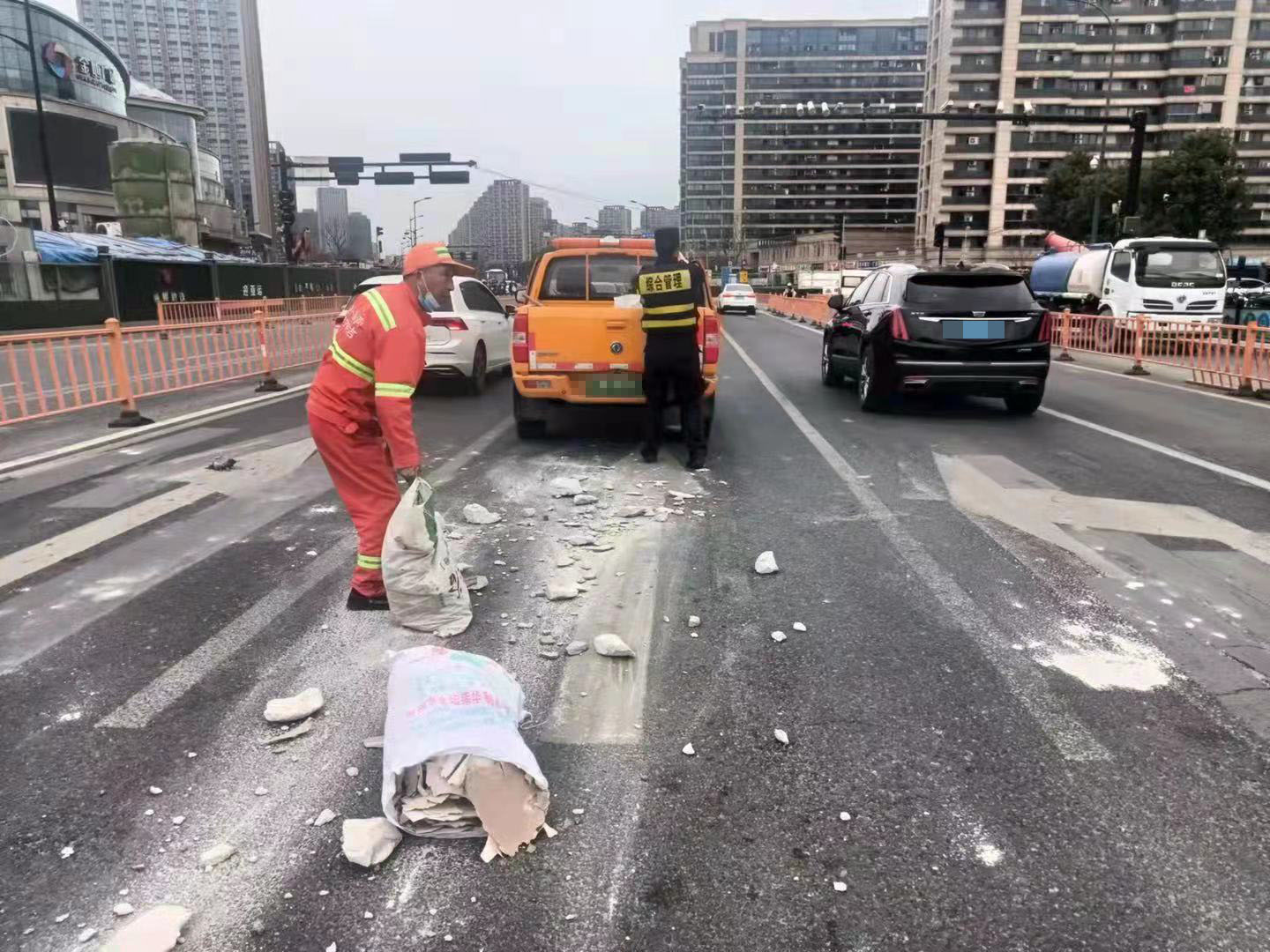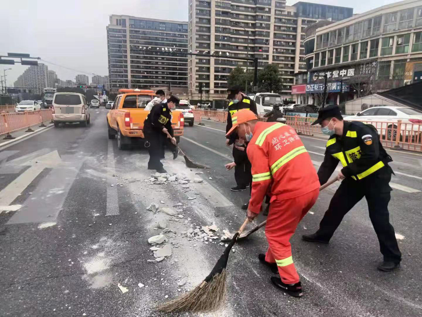 當(dāng)日,楊培發(fā)、王正、張思俊、黃加武、張亞飛在金家渡地鐵站C出入口巡查時(shí),看見馬路中間有一堆路過車輛掉落的建筑垃圾,過往車輛紛紛避讓,存在著極大的安全隱患。