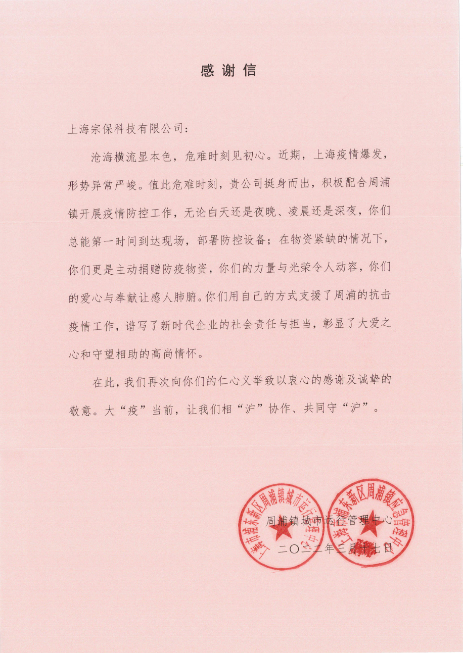 3月17日,上海宗??萍加邢薰臼盏街芷宙?zhèn)城市運行管理中心和周浦鎮(zhèn)應(yīng)急管理中心的感謝信,感謝宗保科技對周浦鎮(zhèn)疫情防控工作的大力支持。