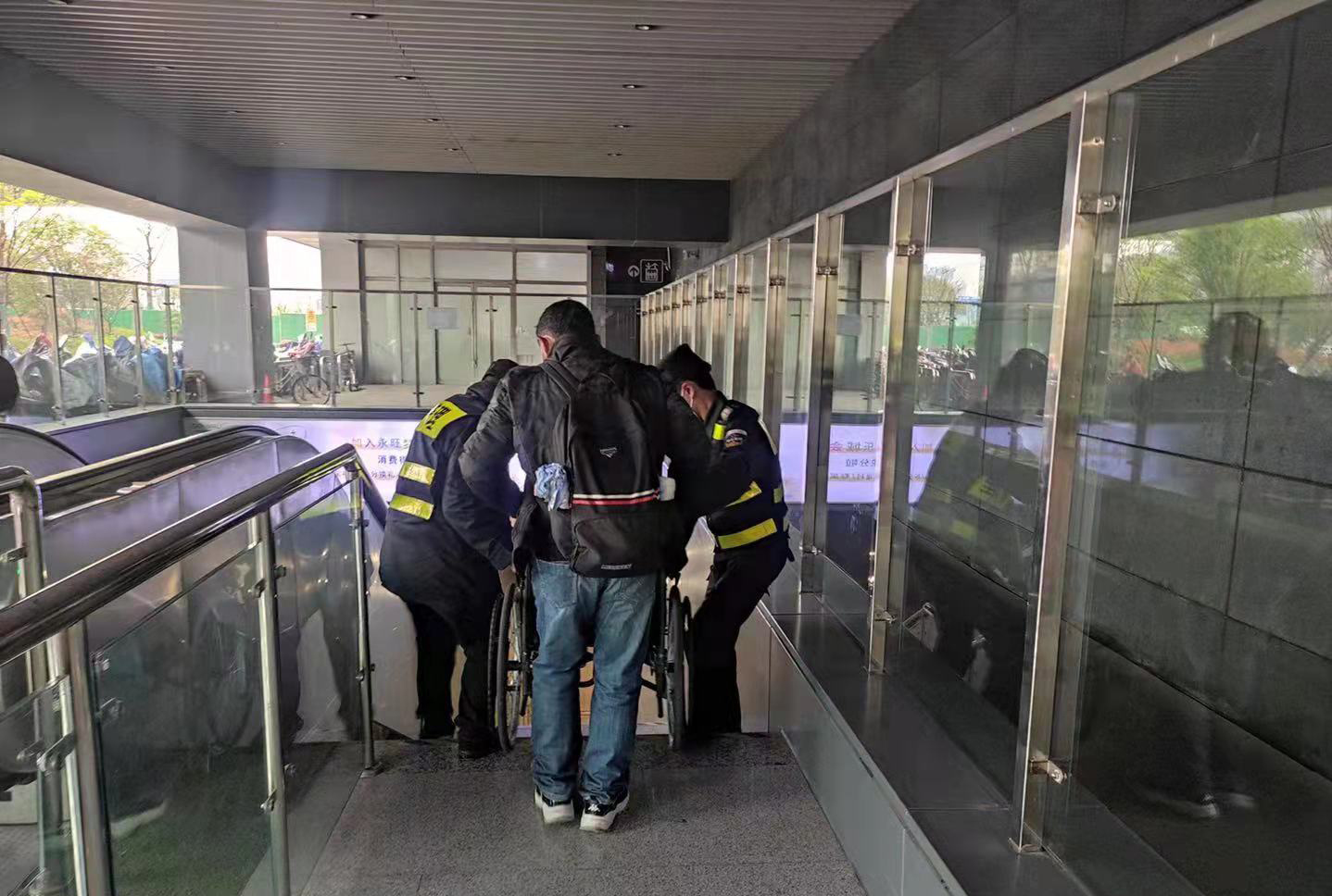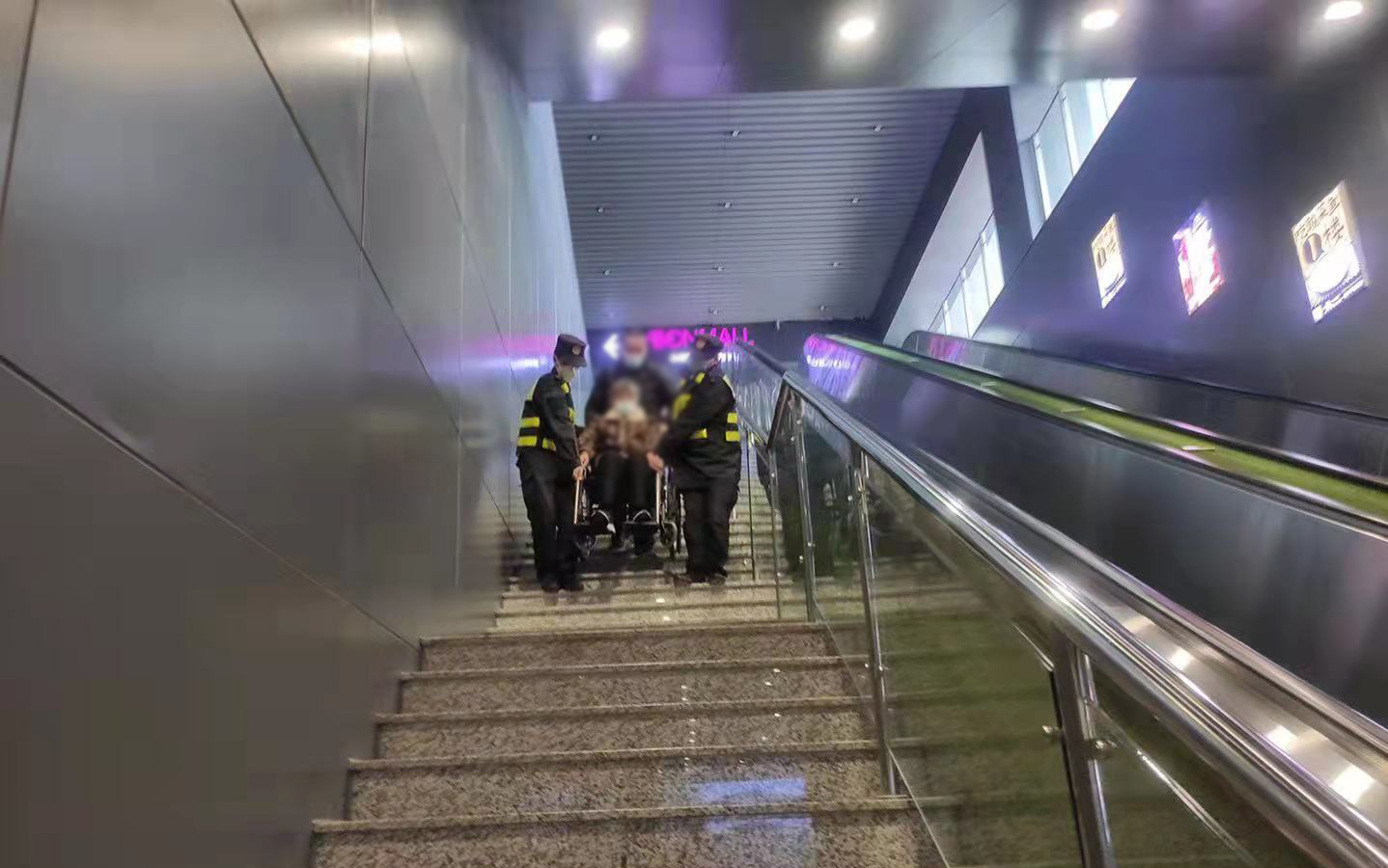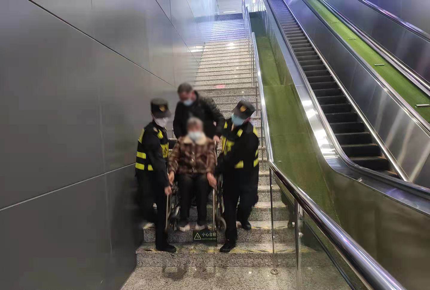 當日10:20,張彬洋和樊粵強在地鐵2號線杜甫村站值勤時,看見有位老人推著輪椅,輪椅上還坐著一位老人,在地鐵出入口駐足觀望,徘徊不前。見此情形,兩位隊員立即上前詢問是否需要幫助。
