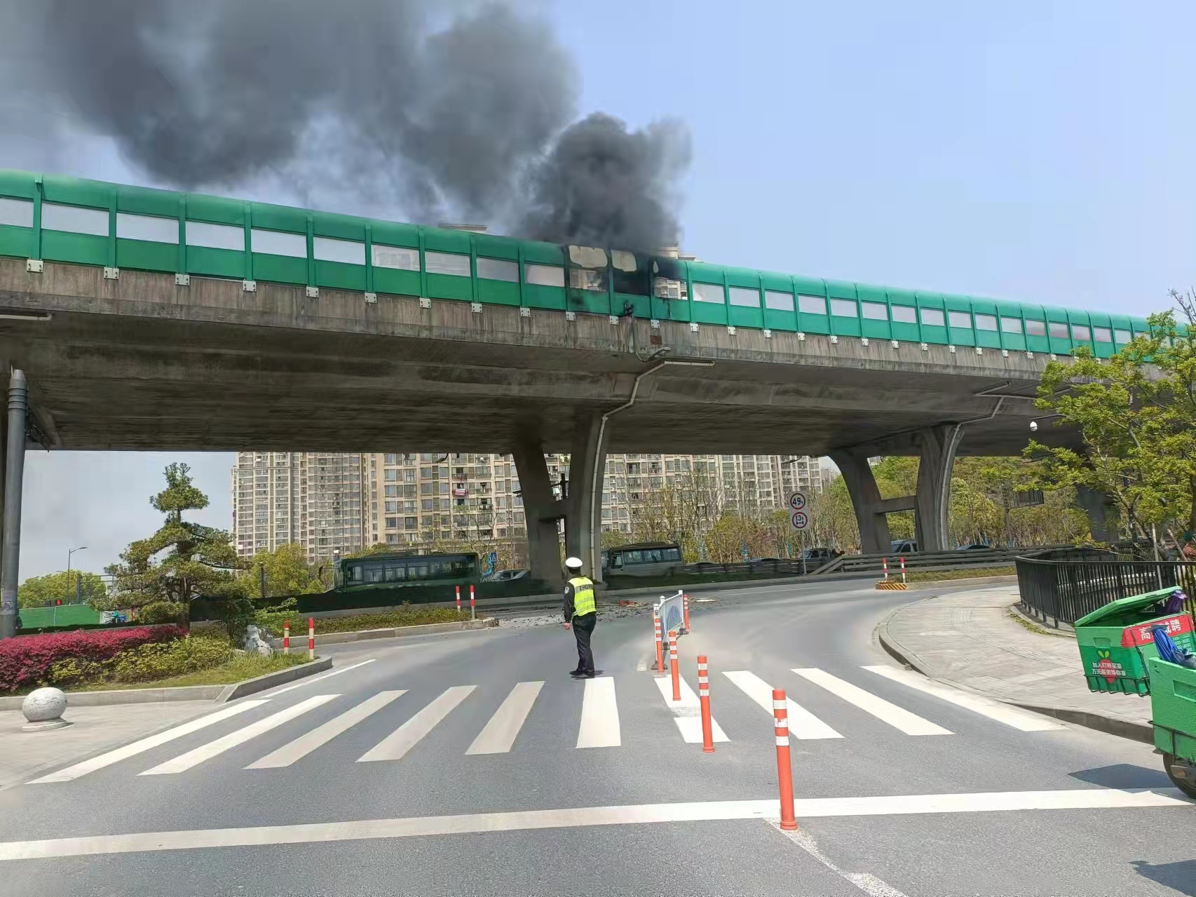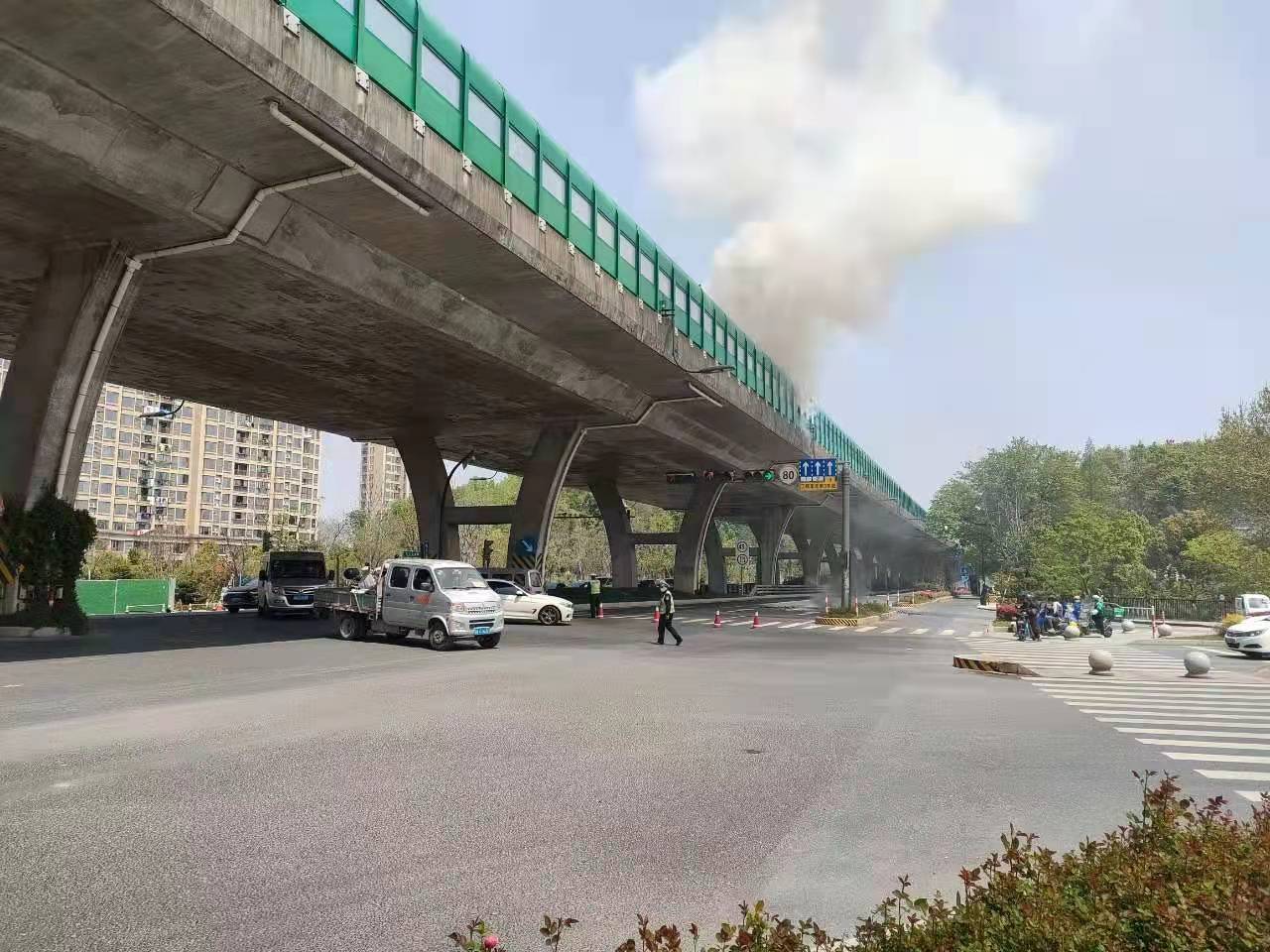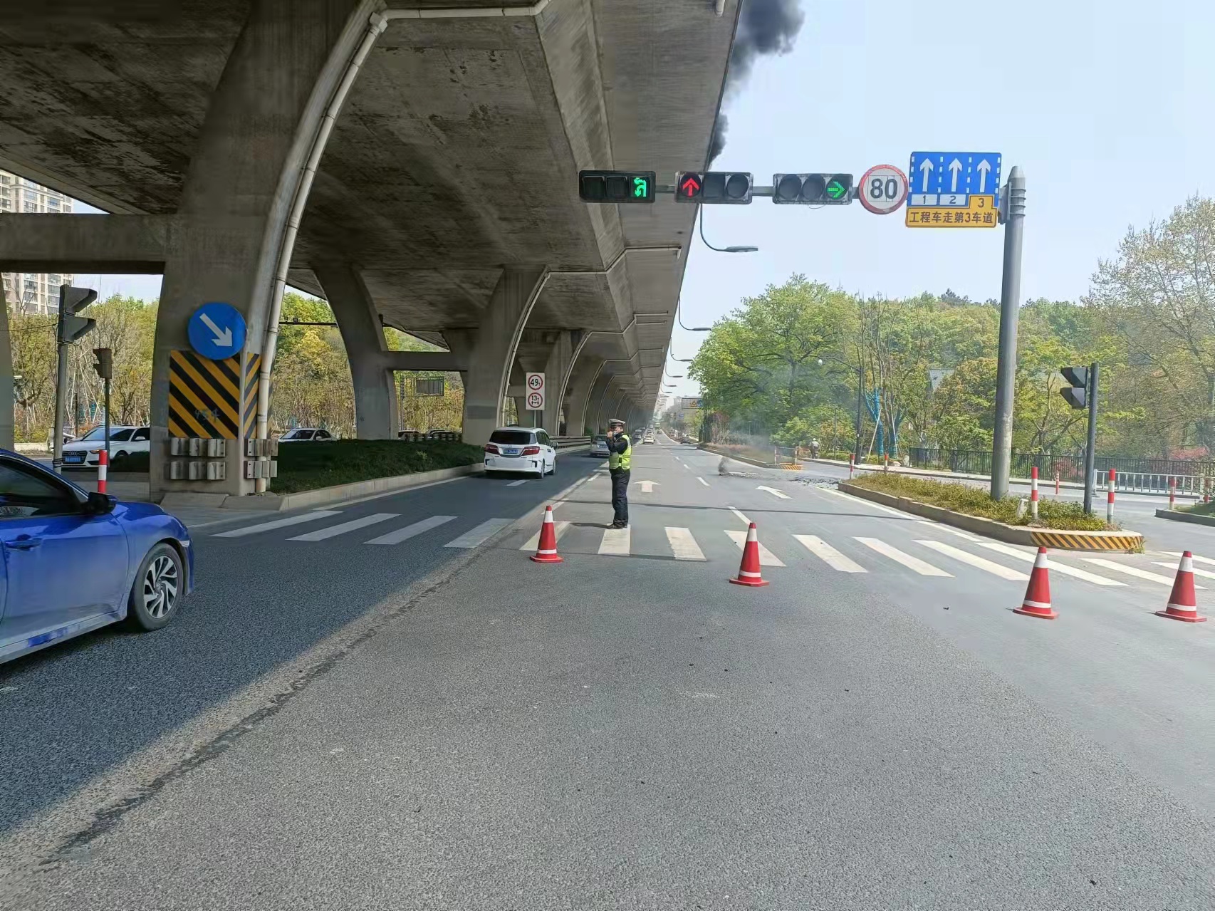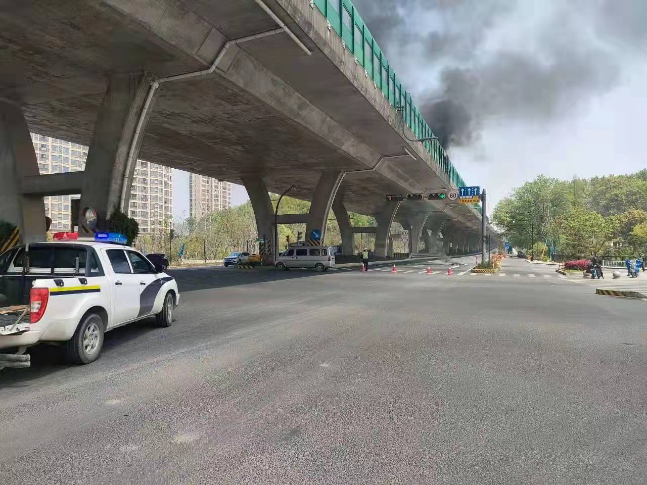 當幾個人趕到高架橋下時,發(fā)現(xiàn)高速隔離板處有明火在燃燒,玻璃碎渣不時掉落下來,橋下情況十分危險。見此情形,馮奧立即將情況上報工作站值班領(lǐng)導(dǎo),協(xié)助引導(dǎo)路面車輛避開繞行,安排同事封閉右轉(zhuǎn)專用車道,避免過往車輛和行人受到傷害。