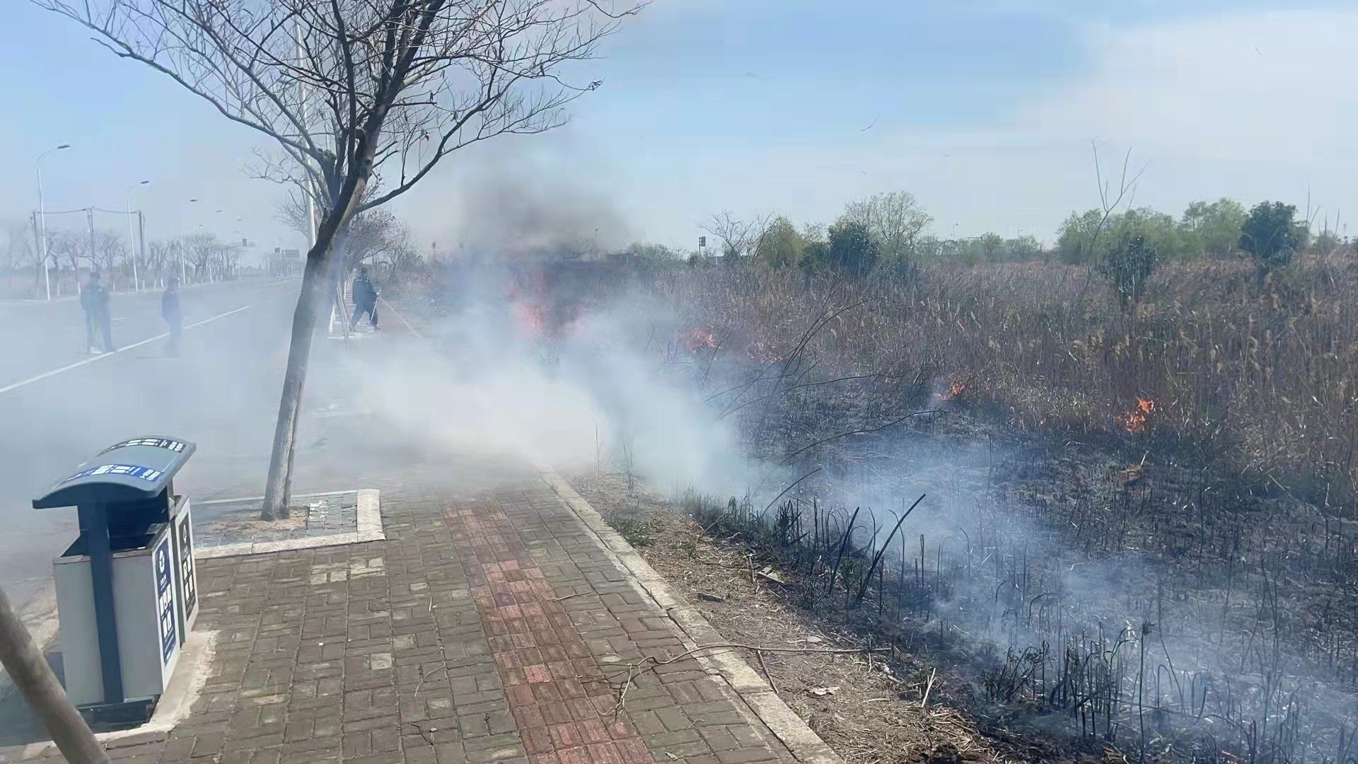 當日12:30,趙鵬和幾位隊員在環(huán)湖一路附近巡邏時,看到不遠處的空地上有黑煙冒起,隨即開著巡邏車前往查看,發(fā)現(xiàn)路邊雜草起火。