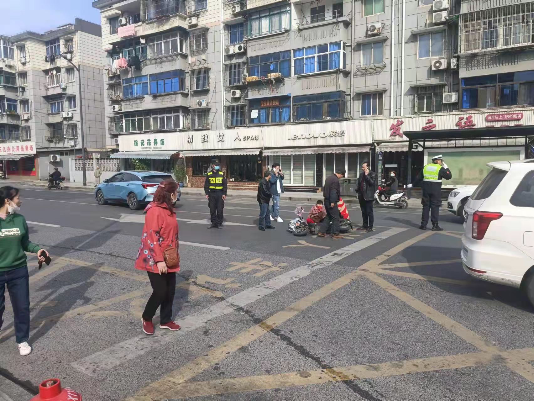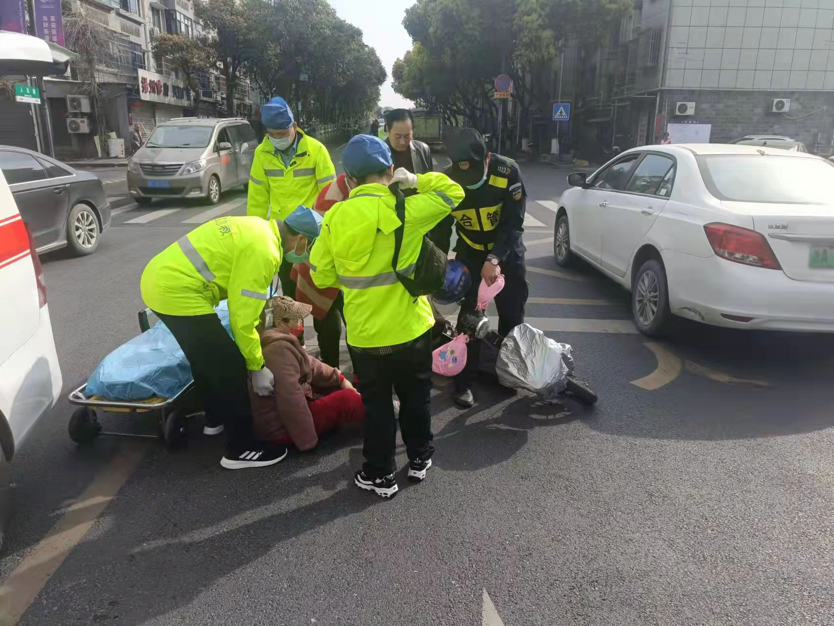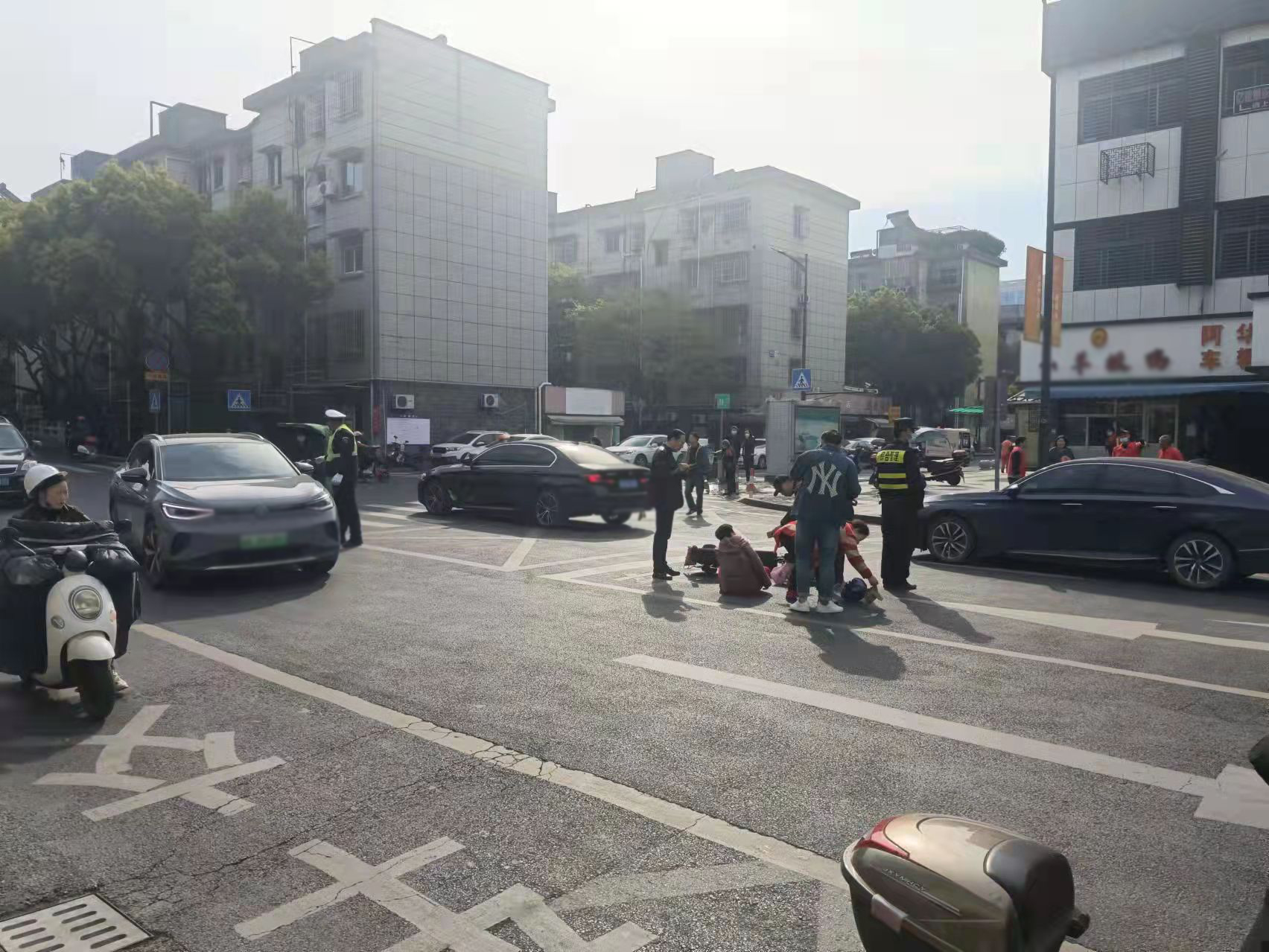 當天9:20,陳國清在文苑路文體中心附近巡邏時,看見前方不遠處的路口發(fā)生了交通事故,便立即前往查看。原來是一輛轎車將騎電動車的阿姨撞倒在地,電動車倒在一旁,阿姨坐在地上。