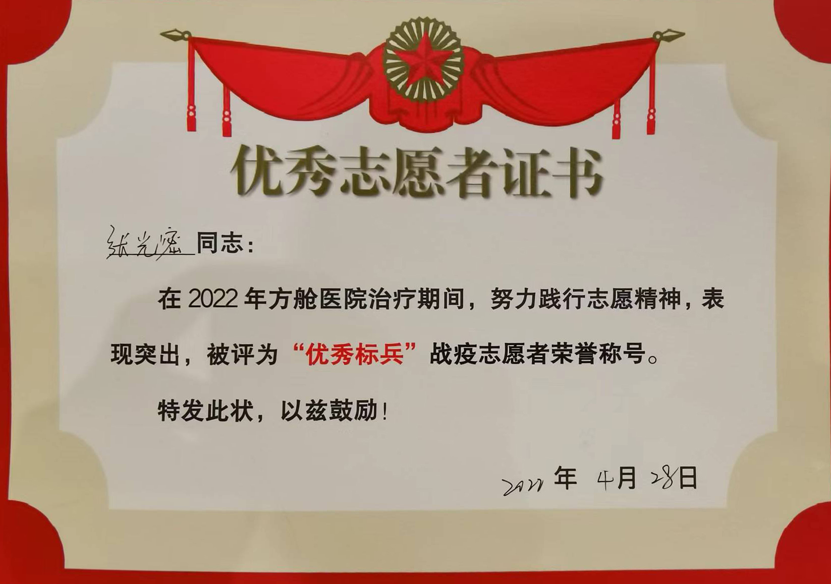 4月28日,宗保公司后勤保障部經(jīng)理張光密在國(guó)家會(huì)展中心(上海)方艙醫(yī)院治療期間,努力踐行志愿精神,表現(xiàn)優(yōu)異突出,被方艙醫(yī)院評(píng)為戰(zhàn)疫志愿者“優(yōu)秀標(biāo)兵”。這個(gè)榮譽(yù)的背后,是傾心擔(dān)當(dāng)?shù)纳鷦?dòng)體現(xiàn),是正能滿滿的充分肯定。