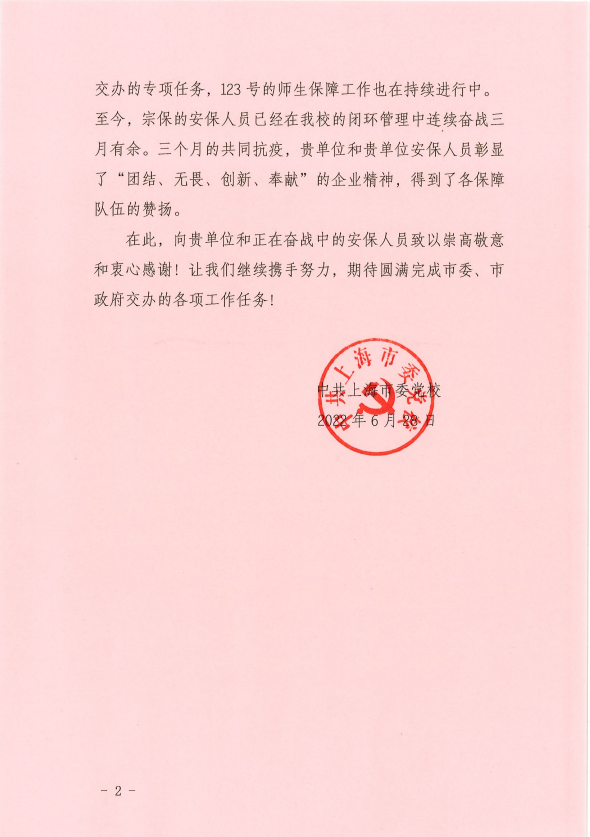 6月28日,中共上海市委黨校送來(lái)感謝信,感謝疫情防控期間宗保公司員工全力配合市委黨校為醫(yī)務(wù)人員提供有力的服務(wù)保障。
