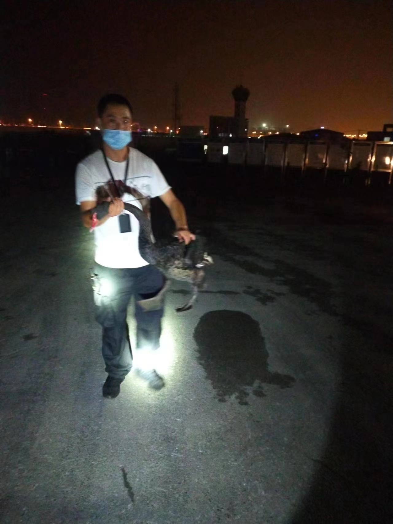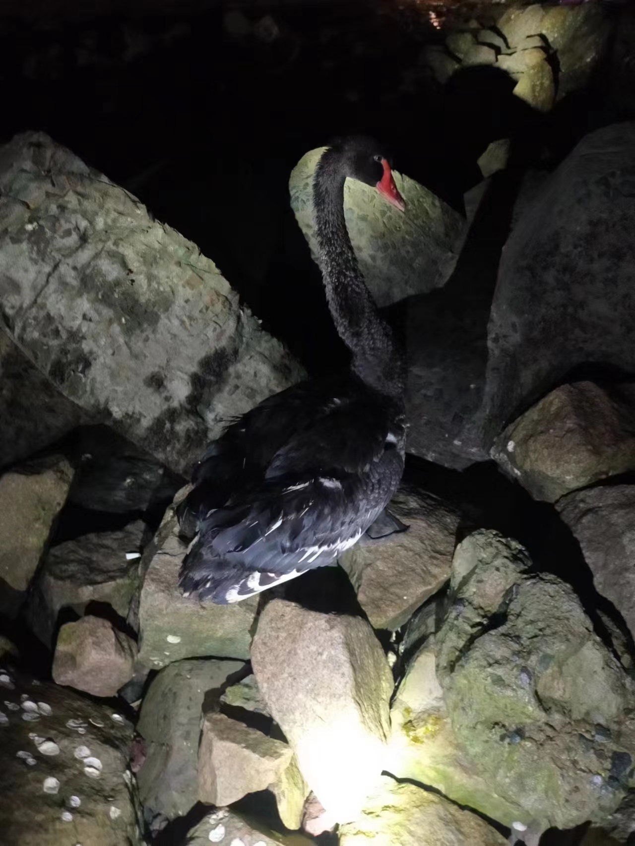 當天23:00,李漢濤和姜永輝在海堤巡查時,發(fā)現(xiàn)一只受傷的黑天鵝。當時,這只大鳥精神不振,渾身顫抖,體力似乎不支,已經(jīng)無法自行飛起。兩人迅即將情況上報給派出所值班民警,并按指示將黑天鵝帶回派出所做進一步處理。