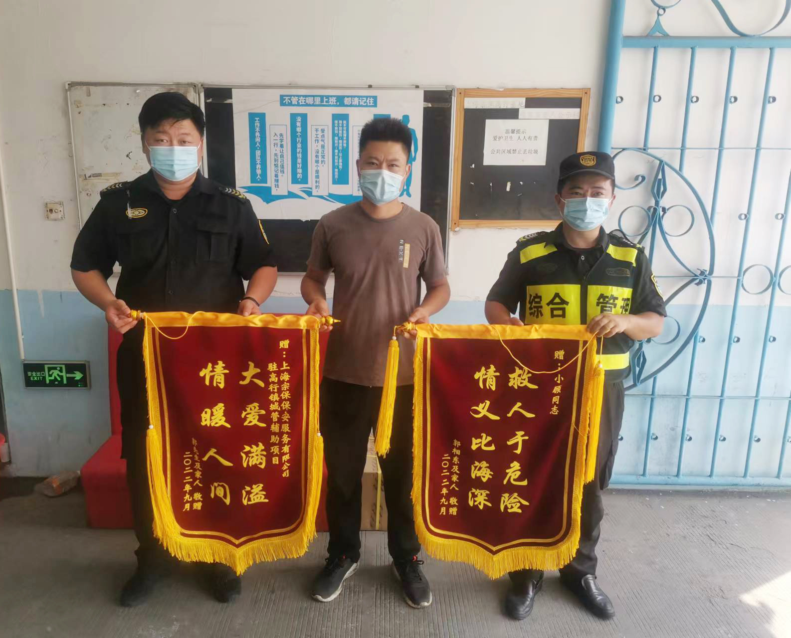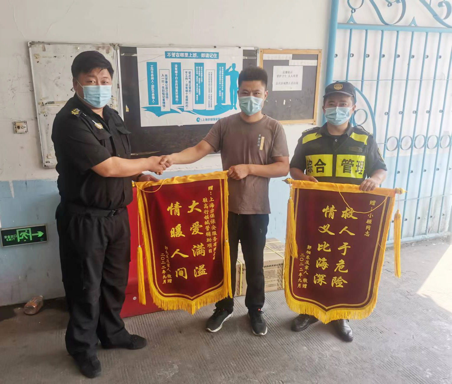 9月8日,宗保公司駐高行市容項(xiàng)目收到市民郭先生送來的兩面繡有“救人于危險(xiǎn) 情義比海深”和“大愛滿溢 情暖人間”的錦旗,感謝宗保員工顧俊機(jī)智救下欲跳樓輕生小男孩的行為。
