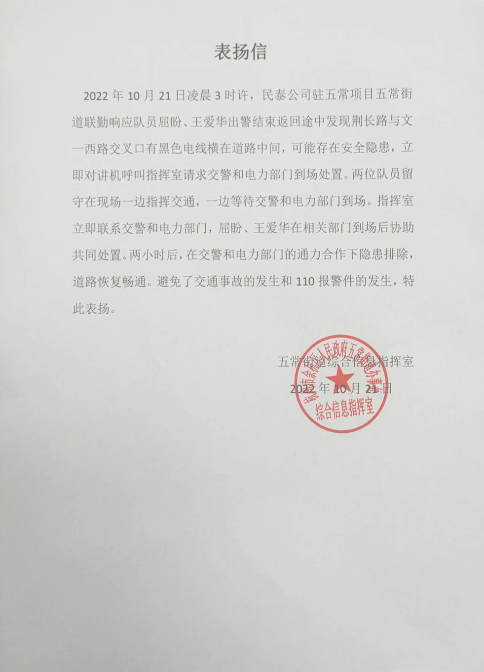 10月21日,浙江民泰公司駐杭州市余杭區(qū)五常市容項(xiàng)目員工協(xié)助處理掉落電線,消除道路安全隱患。