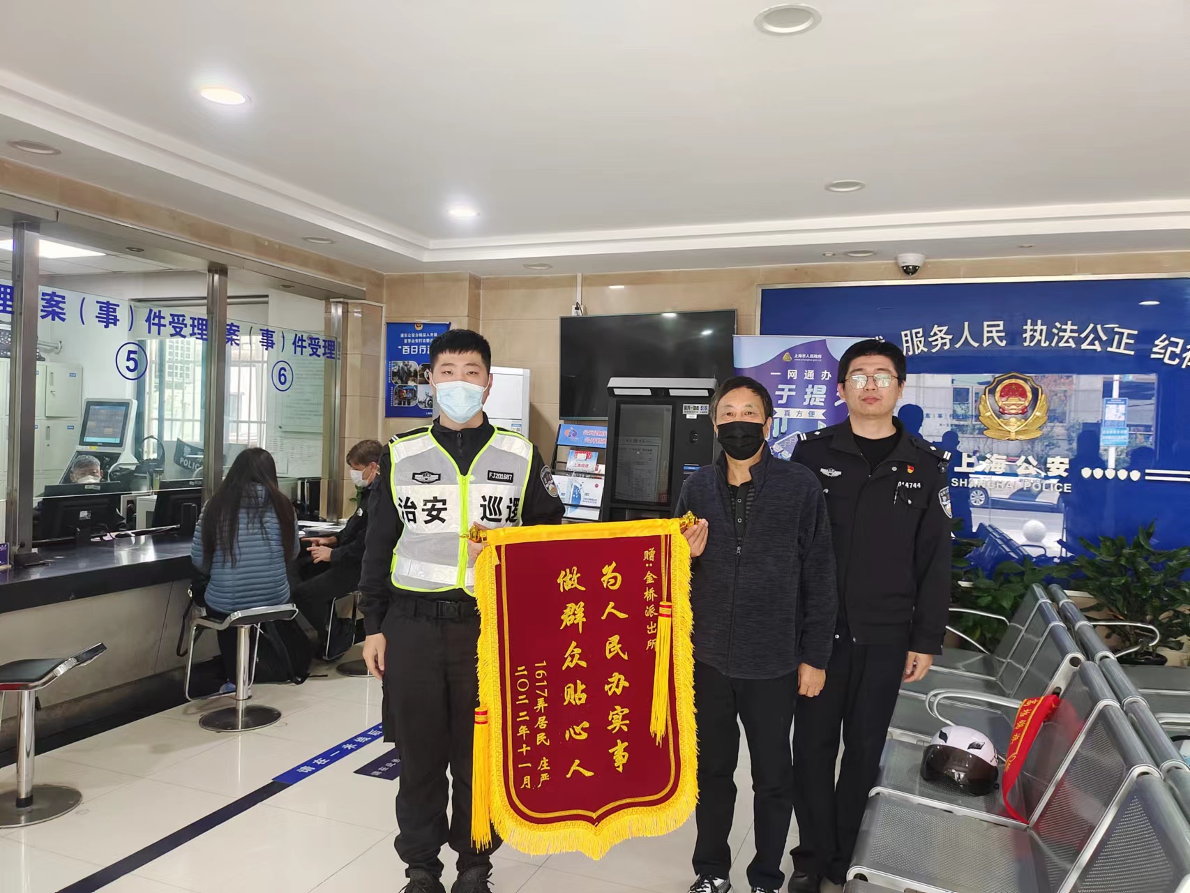 11月28日,上海市公安局浦東分局金橋派出所收到市民莊先生送來的一面繡有“為人民辦實事 做群眾貼心人”的錦旗,感謝宗保公司駐金橋派出所項目員工幫其找回丟失的自行車和手機。
