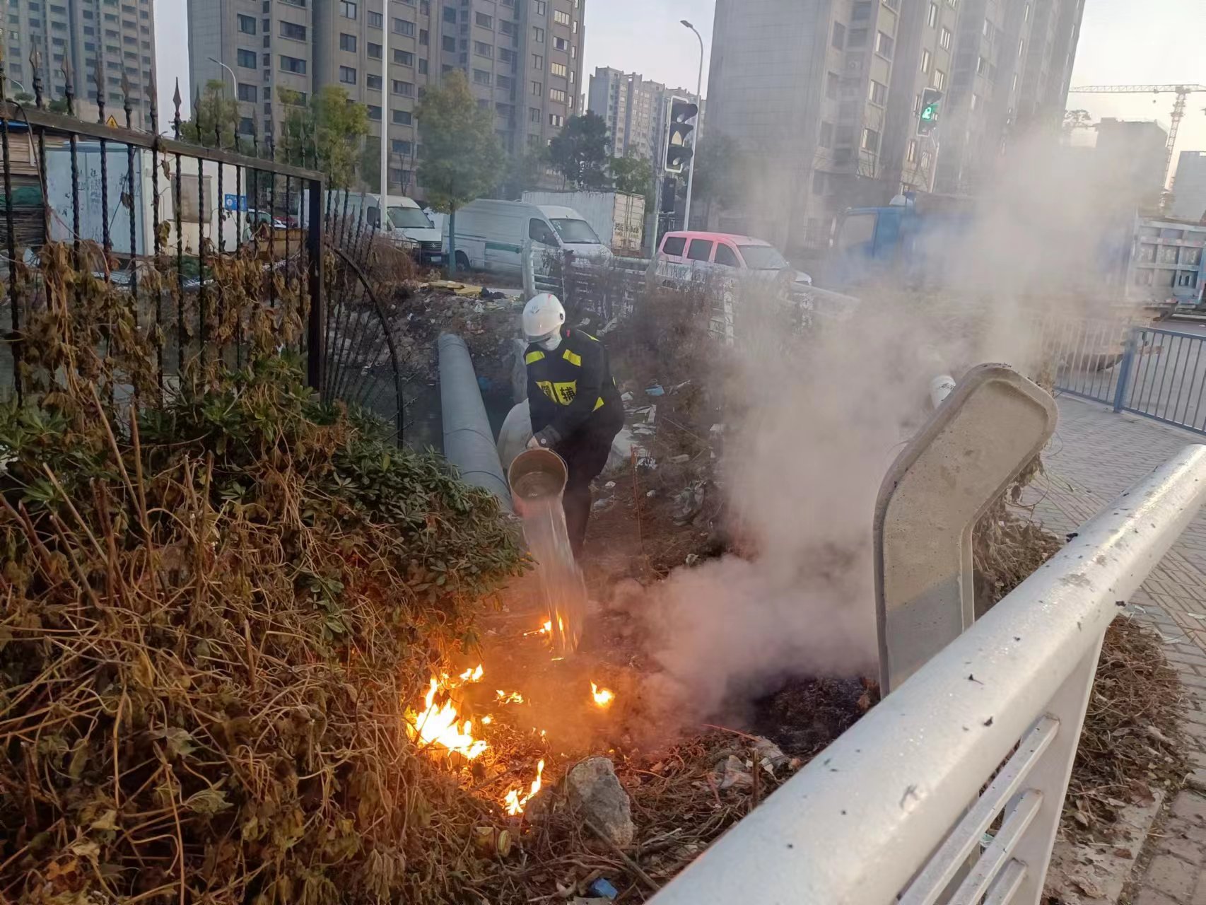 為防止火勢延燒擴大,李山和鄭彥兵連忙從河道廢棄物堆放處撿來涂料桶,來回輪番從河道提水滅火。經(jīng)過兩人的努力,橋邊的野火很快被控制并撲滅。