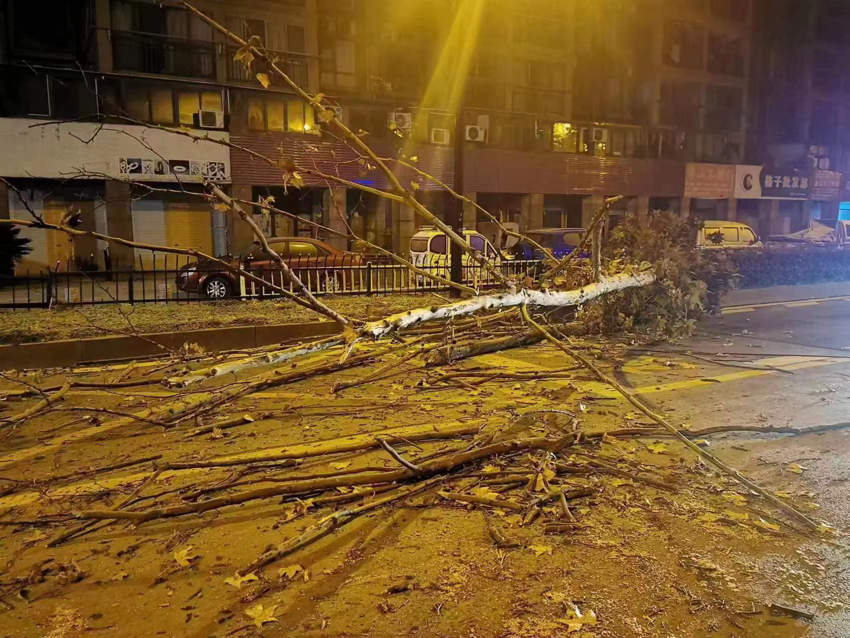 兩人迅疾來到現(xiàn)場,一棵大樹折斷后橫在馬路上,凌亂的枝干正好將馬路攔腰截?cái)啵囕v通行嚴(yán)重受阻。由于時(shí)值凌晨,附近商戶沒有開門,兩人也無排障工具,于是就在現(xiàn)場設(shè)立了警戒線,向指揮中心報(bào)告情況并呼叫增援。