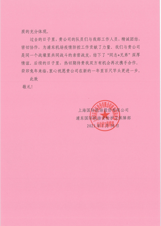 隨著疫情防控政策的優(yōu)化調(diào)整,公司駐浦東國際機(jī)場疫情防控項目完成了其使命,但公司將銘記甲方的褒獎和激勵,繼續(xù)保持機(jī)場疫情防控中所展現(xiàn)出來的擔(dān)當(dāng)情懷、奉獻(xiàn)精神和工作作風(fēng),為持續(xù)助推城市精細(xì)化管理,傳遞城市溫情,提升城市溫度,貢獻(xiàn)宗保力量。