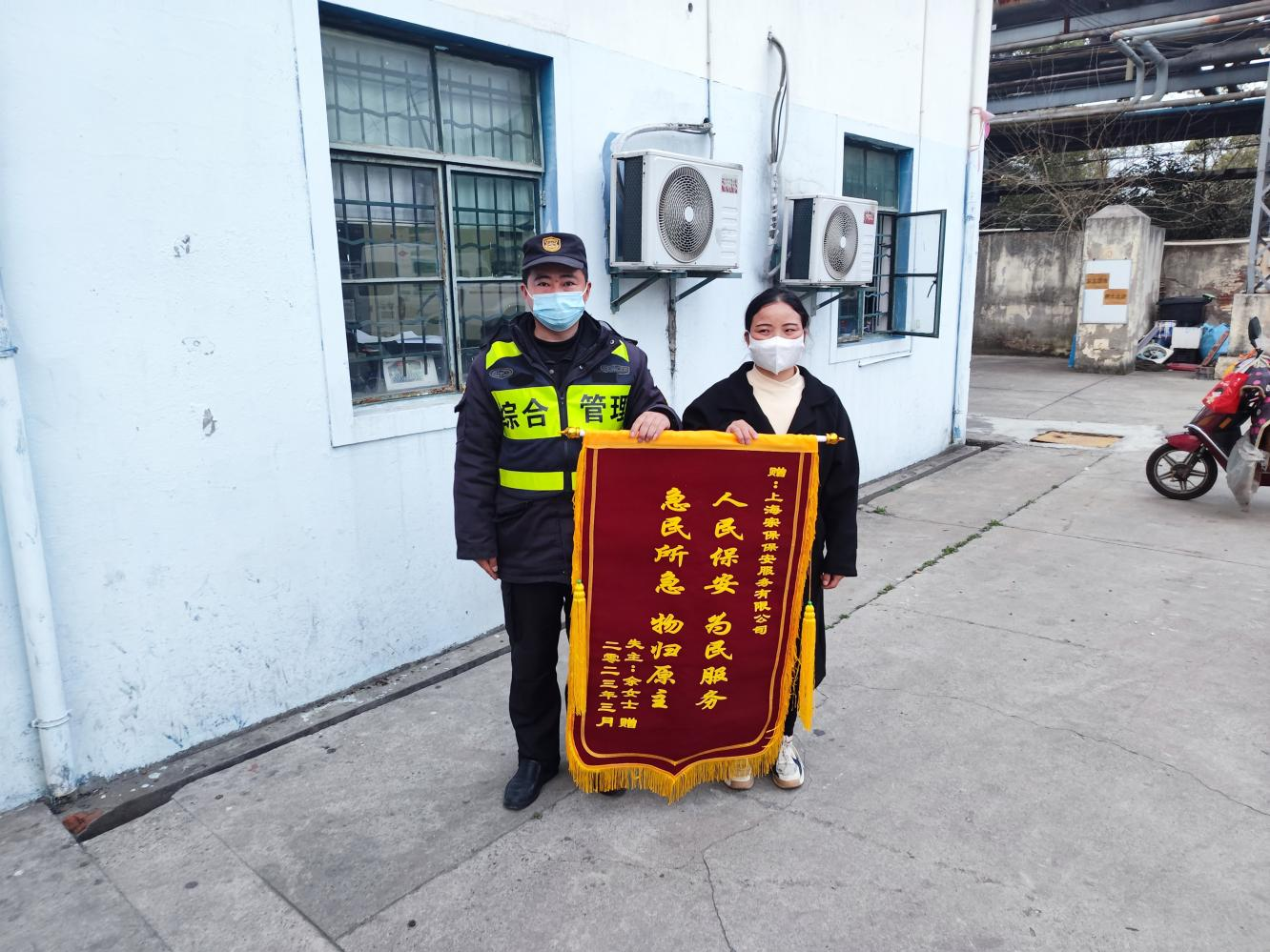 3月9日,失主的家人特意來到公司駐高行市容項(xiàng)目的住處,向顧俊贈(zèng)送一面繡有“人民保安 為民服務(wù) 急民所急 物歸原主”的錦旗以表示感謝。