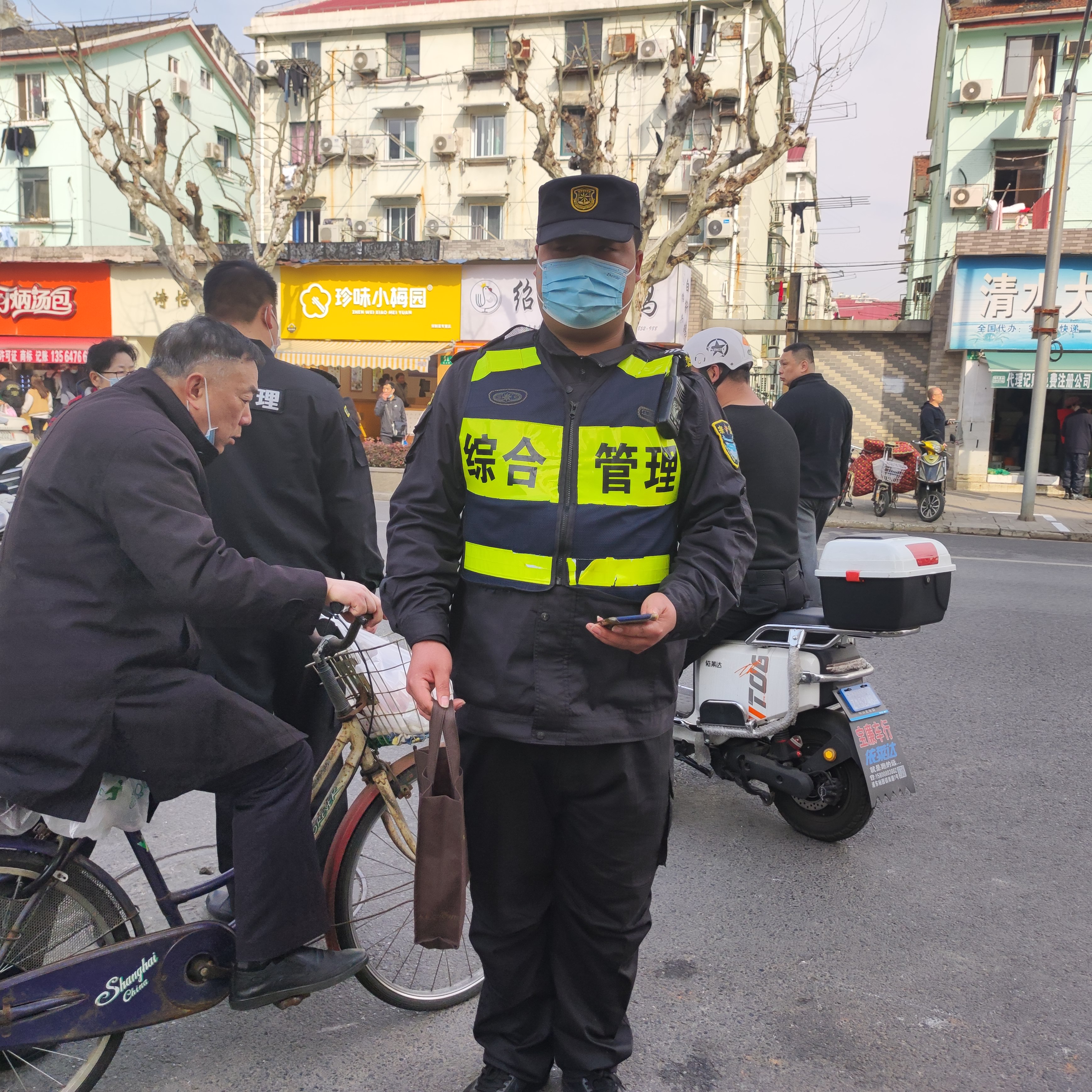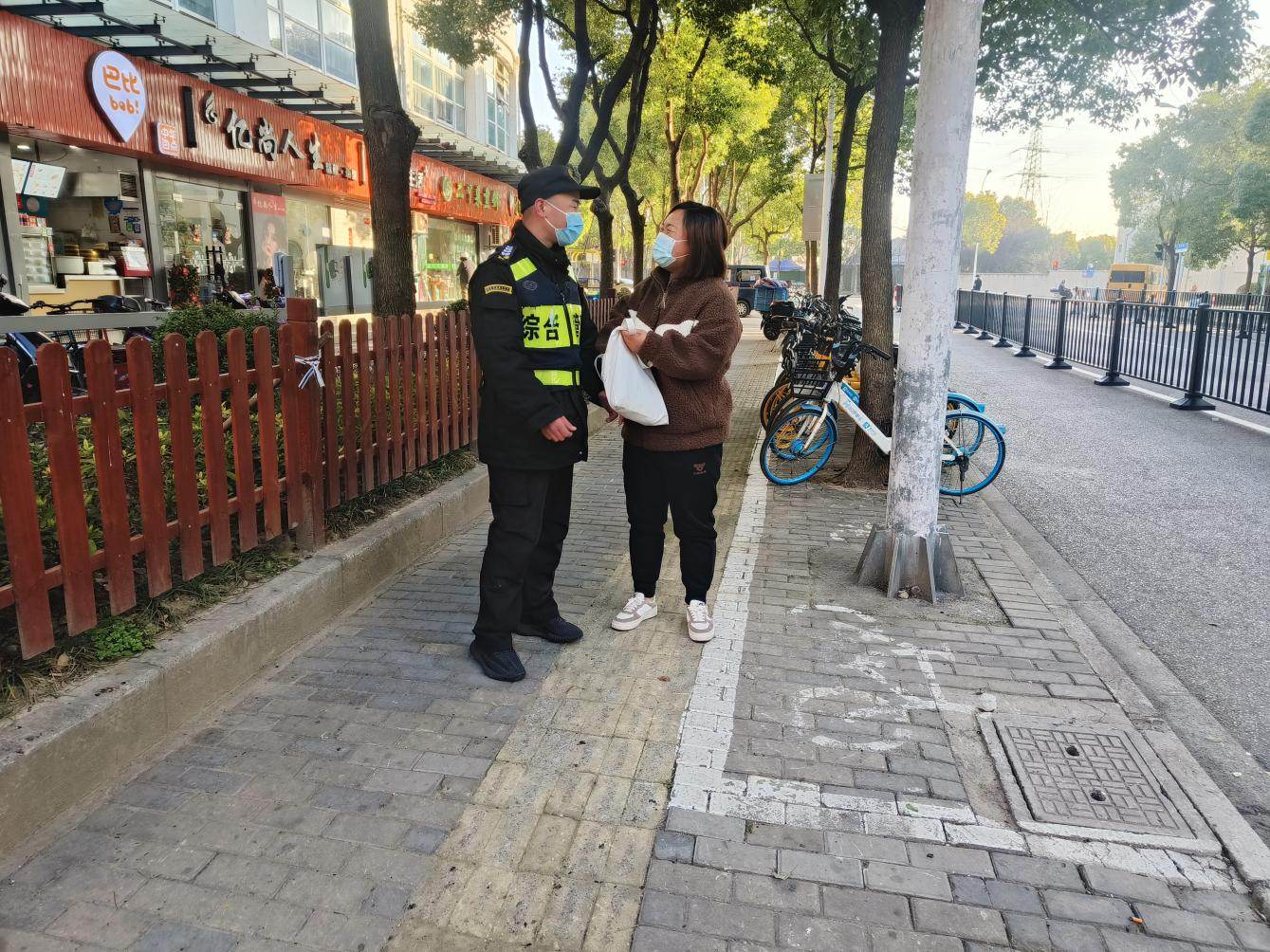當(dāng)天9:00,公司員工梁奇巡邏至高行鎮(zhèn)秋嵐路蘭谷路交叉口附近時(shí),發(fā)現(xiàn)一輛共享單車的把手上掛著一個(gè)白色手提袋,而周圍沒有人。