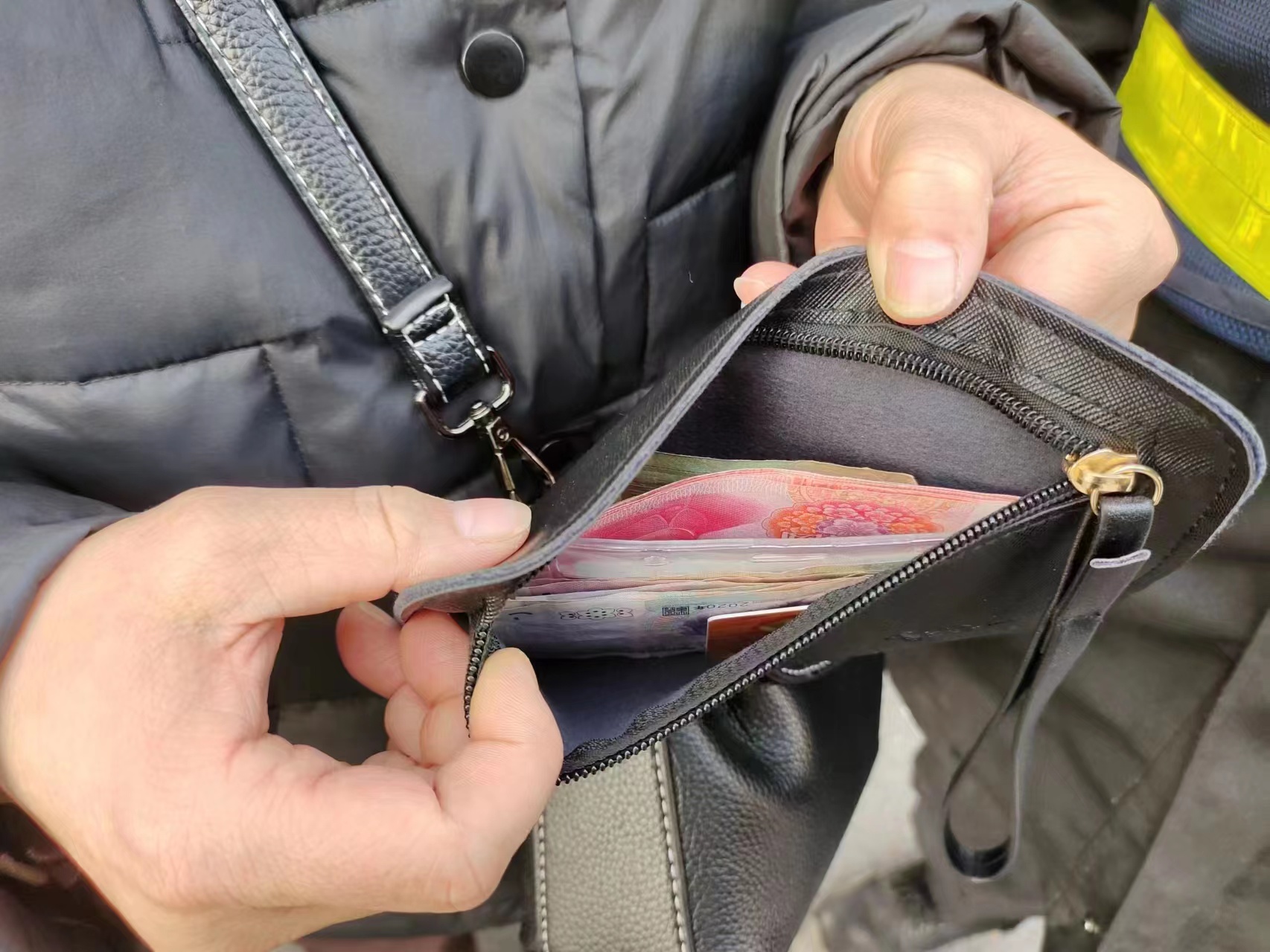 兩人等了30多分鐘,仍未見人來認(rèn)領(lǐng),便將錢包上交了城管中隊(duì)。8:50左右,一位身穿黑衣聽聞信息的女子趕到城管中隊(duì)認(rèn)領(lǐng)錢包。