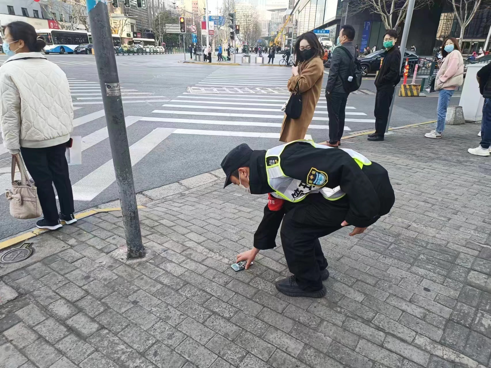 當(dāng)日8:08,公司員工任金在閔行區(qū)莘莊工業(yè)區(qū)中春路鑫都路路口值勤時(shí),撿到一部華為手機(jī),便立即按照工作流程拍照取證,并上報(bào)了項(xiàng)目負(fù)責(zé)人。