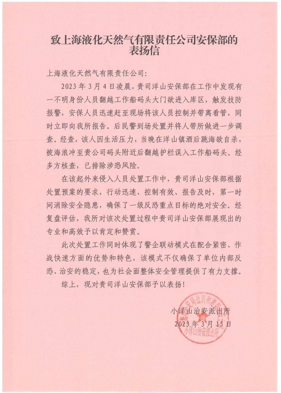 3月15日,宗保公司駐洋山天然氣項(xiàng)目收到小洋山治安派出所的表揚(yáng)信,信中對公司員工出色的工作表現(xiàn)給予了表揚(yáng)。