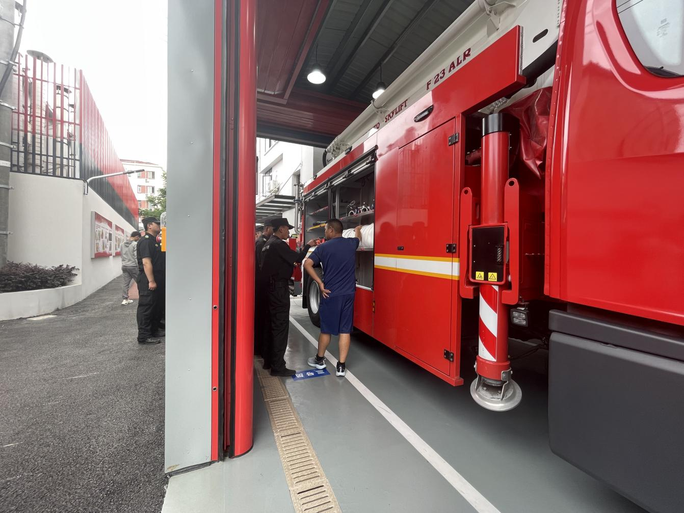 隨后,骨干們又參觀了消防車,直接真實地了解了消防車的性能、如何進行高大樓宇滅火、車載的消防器材以及用途和作用,并與消防應急救援人員進行了互動交流,開展了相關消防器材實操演練。