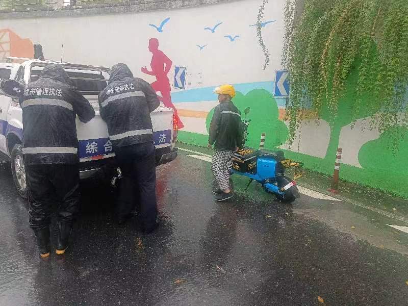 當(dāng)日15:54,公司員工吳寶和李忠英在臨丁路體育公園涵洞邊巡查涵洞內(nèi)積水情況時(shí),發(fā)現(xiàn)一外賣小哥推著電瓶車艱難地在暴雨中行走,兩人見(jiàn)狀便主動(dòng)上前詢問(wèn)。