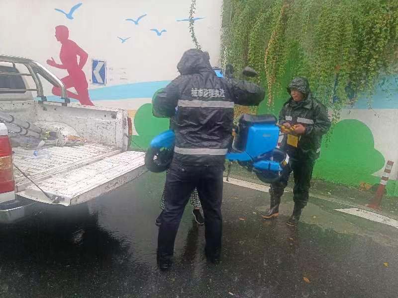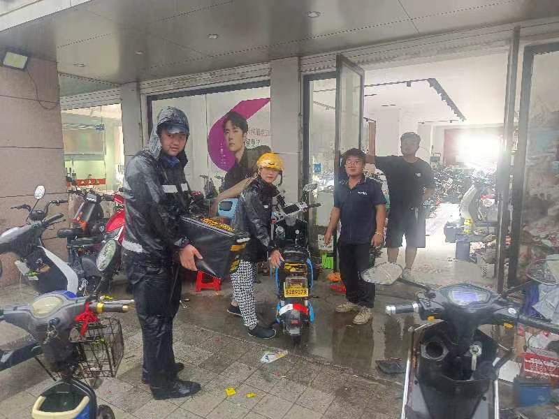 8月17日,浙江民泰駐杭州市臨平區(qū)星橋市容項(xiàng)目員工熱心幫助暴雨中爆胎外賣小哥。