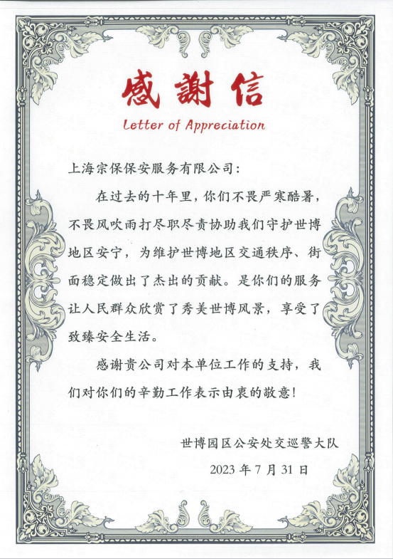世博園區(qū)公安處交巡警大隊贈送錦旗致感謝信,是對公司駐世博園項目工作的充分肯定,既是一份榮譽(yù)和褒獎,更是一種激勵和鼓舞。員工們表示,將不辜負(fù)領(lǐng)導(dǎo)的期望,繼續(xù)保持和發(fā)揚扎實工作、愛崗敬業(yè)的工作作風(fēng),再接再厲,再創(chuàng)佳績,為助力轄區(qū)平安建設(shè)續(xù)寫新的篇章。