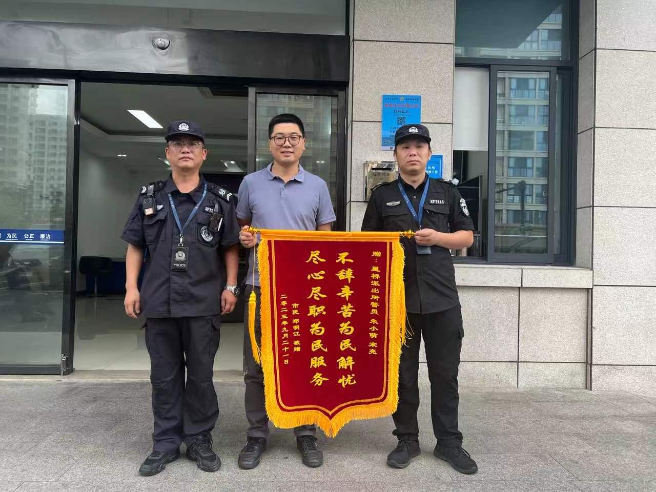 9月21日,浙江民泰公司駐杭州市臨平區(qū)星橋派出所輔助項(xiàng)目員工收到市民鄭先生送來的繡有“不辭辛苦為民解憂 盡心盡職為民服務(wù)”的錦旗,感謝公司員工宋亮和朱小萌盡心為民幫助其找到了走失的母親。