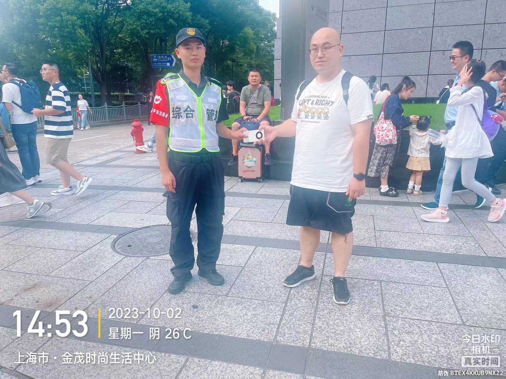 10月2日14:30,宗保公司駐浦東新區(qū)三林市容項目員工凌帥龍在陸家嘴金茂大廈附近值勤時,撿到一部華為手機。因手機設(shè)有鎖屏密碼,無法聯(lián)系到失主,凌帥龍便將情況報告了當(dāng)班組長,并按指示留在原地等待失主。幾分鐘后,一位男士打來電話,語氣十分焦急,稱自己的手機掉了。凌帥龍初步了解情況后,與他約好碰面的地點。大約過了20多分鐘,一位身穿白色T恤的男士趕來認領(lǐng)。凌帥龍核實確認男士是失主后,就將手機交還給了他。男士拿到手機,再三地向員工凌帥龍表示感謝。