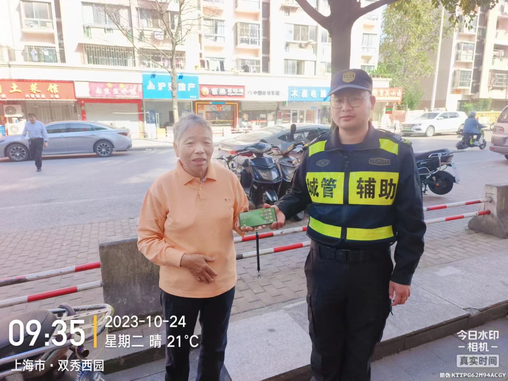 10月24日9:05,宗保公司駐浦東新區(qū)康橋市容項目員工李建成在梓康路秀海路路口巡查時,撿到一部華為手機和一張門禁卡,隨即報告了班組長,并按指示在原地等待。大概過了30分鐘左右,一位說話緩慢、細語輕聲的女士打來電話,說自己的手機丟了。李建成問了問手機的基本信息,便與她約定好碰面的地點。不一會,一位滿頭白發(fā)的老人趕來,李建成通過老人解鎖手機密碼,確認其是失主后,就把手機交還給了她。