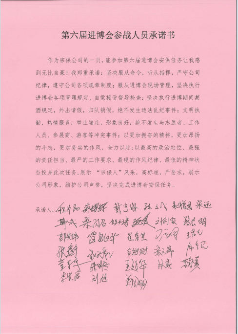 10月24日,公司舉行進博會安保誓師動員大會,參加安保的員工簽訂承諾書,人人作出莊重承諾。隨后,根據(jù)進博會安保有關要求進駐進博園區(qū),協(xié)助配合做好現(xiàn)場秩序維護、參博人員疏導、車輛進出指引以及外圍虹橋樞紐周邊交通疏導、陸家嘴區(qū)域和接待區(qū)酒店周邊市容環(huán)境秩序維護等工作。