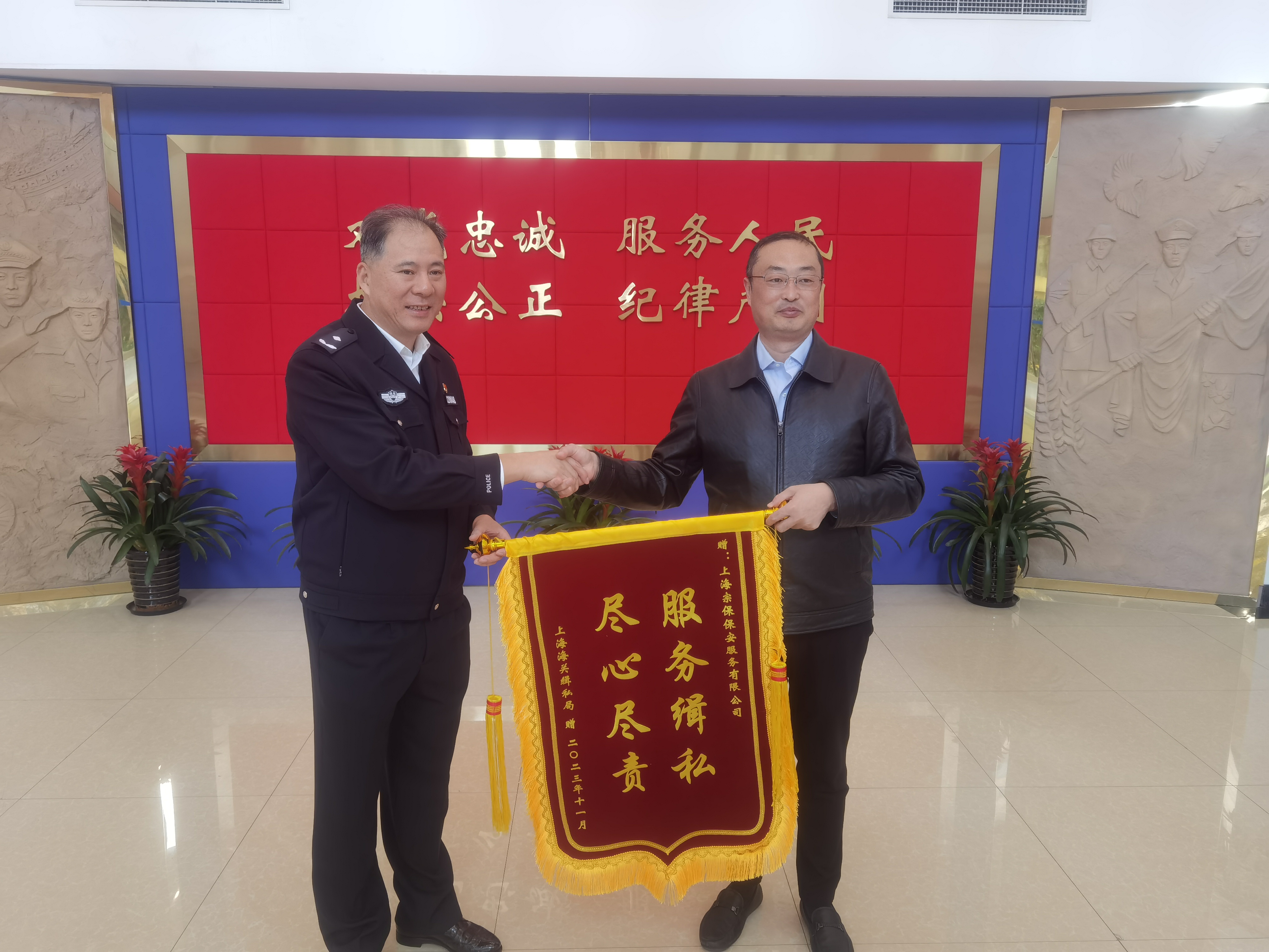 11月29日,上海海關(guān)緝私局辦公室主任李培錦將一面繡有“服務(wù)緝私 盡心盡責(zé)”的錦旗贈(zèng)送給宗保公司總經(jīng)理蔣德玉,感謝公司對緝私局工作的大力支持和配合。