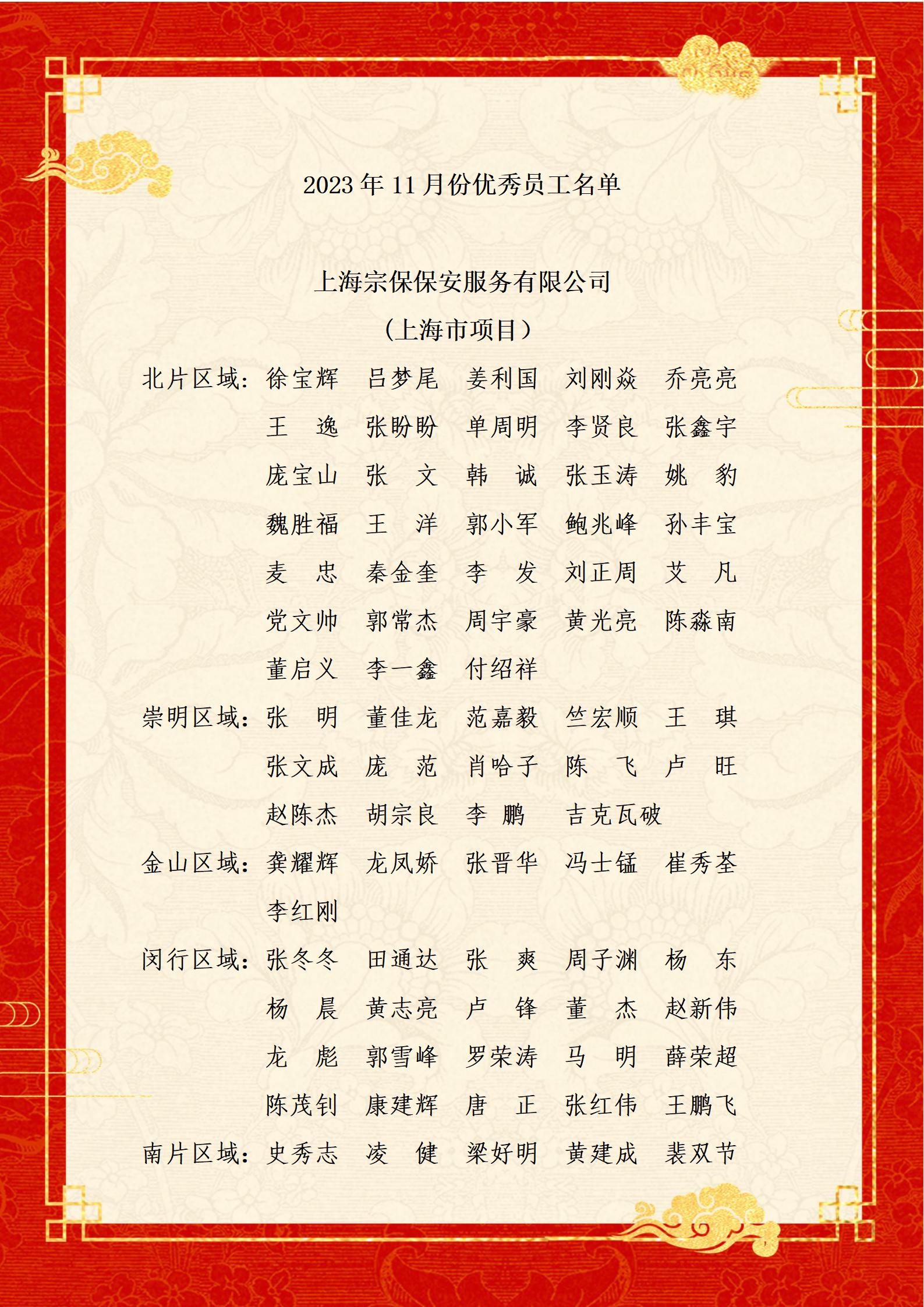 11月份,公司廣大員工根據(jù)甲方的任務(wù)要求,按照公司的部署安排,積極踐行公司“誠(chéng)信為本 服務(wù)至上”的經(jīng)營(yíng)理念,持續(xù)發(fā)揚(yáng)勇于擔(dān)當(dāng)、善作善為的工作作風(fēng),助力完成了第六屆中國(guó)國(guó)際進(jìn)口博覽會(huì)、2023斯巴達(dá)勇士賽杭州站等大型活動(dòng)安保任務(wù),全力配合甲方做好了城市管理輔助、治安巡邏聯(lián)防、物業(yè)服務(wù)保障、生態(tài)環(huán)境保護(hù)、高鐵線路巡防等工作。期間,涌現(xiàn)出了一批盡心履責(zé)、崗位建功、拾金不昧、熱心助人的優(yōu)秀員工和先進(jìn)典型。