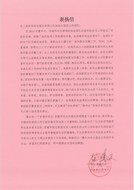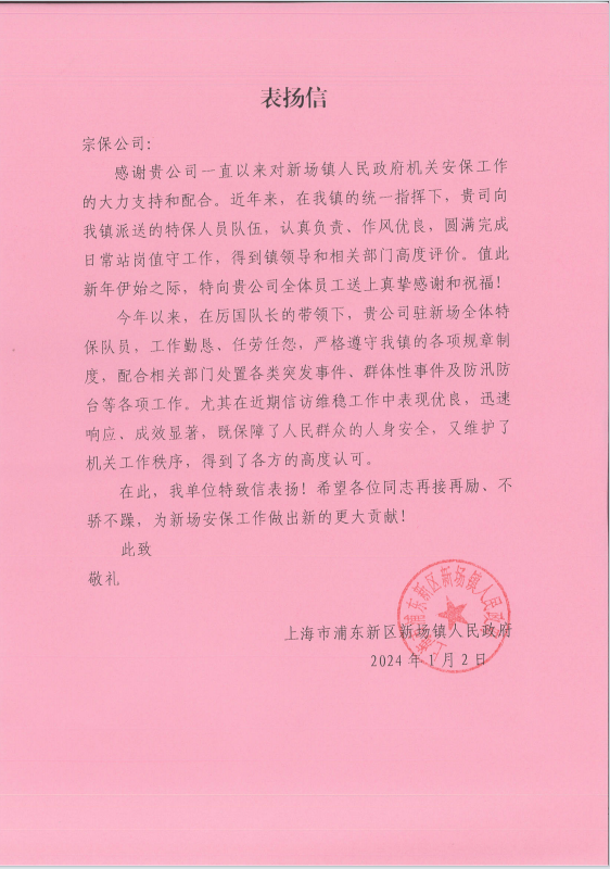 1月2日,宗保公司駐浦東新區(qū)新場鎮(zhèn)人民政府輔助項目收到鎮(zhèn)政府的表揚信,表揚項目隊長厲國,愛崗敬業(yè)、任勞任怨,素質(zhì)過硬、責(zé)任心強(qiáng),團(tuán)結(jié)帶領(lǐng)項目員工嚴(yán)格遵守鎮(zhèn)政府管理規(guī)定,全力配合鎮(zhèn)相關(guān)部門做好秩序維護(hù)工作善作善為的精神。