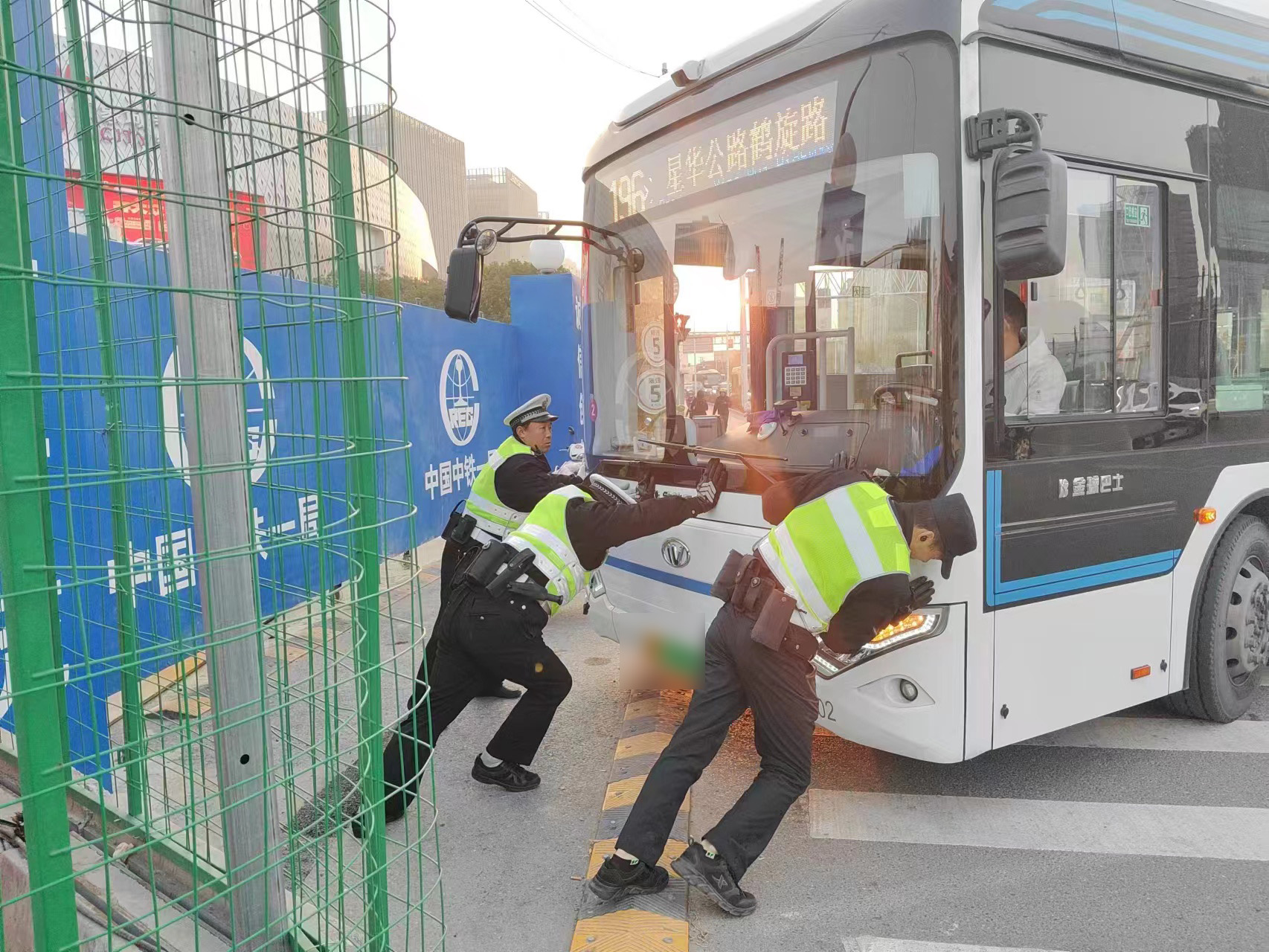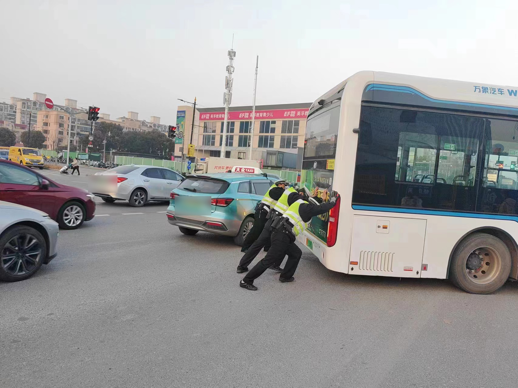 兩人見狀上前詢問,原來公交車發(fā)生故障無法啟動??紤]到公交車停在馬路中間,不但影響其他車輛的正常通行,還存在一定的安全隱患,于是兩人與公交車駕駛員商量后,就立即呼叫附近崗位同事前來幫忙推車。