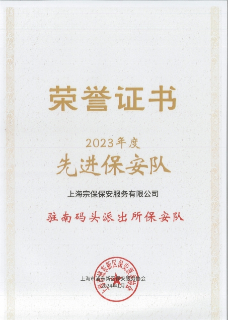 公司浦東新區(qū)公安分局南碼頭派出所保安隊被評為2023年“先進保安隊”
