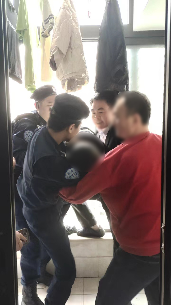 凌邵凱和李梟琦很快趕到事發(fā)小區(qū)樓下,發(fā)現(xiàn)一名女子趴在12樓陽臺上,一只腳已經(jīng)懸空,一名男子正拉著她的雙手,似乎還在爭執(zhí)著什么。兩人見狀,快速跑到12樓,使勁地敲門卻一直沒人開門,防盜門堅固又一時難以破門而入。