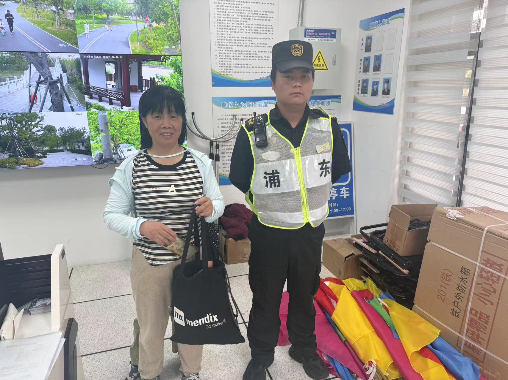 17:00,當(dāng)楊召群再次巡查到楊高南路1998號(hào)時(shí),發(fā)現(xiàn)失主在附近留有尋物啟事,隨即按照啟事上的電話與失主取得了聯(lián)系,確定對(duì)方是失主后,就讓失主前往南碼頭城運(yùn)中心領(lǐng)取手提包。