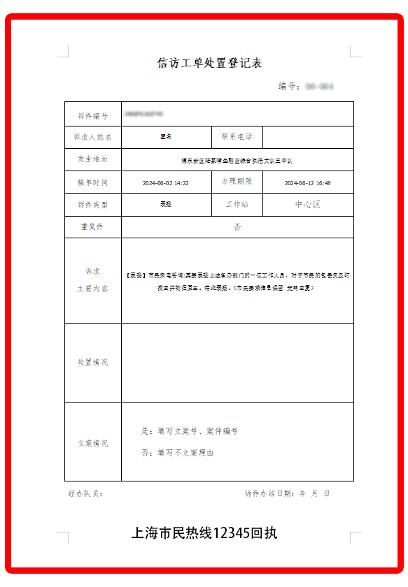 男子見漆遼強(qiáng)堅(jiān)決不肯收紅包,被他拾金不昧的行為所感動(dòng),便主動(dòng)撥打了上海市民熱線12345,點(diǎn)名表?yè)P(yáng)了宗保公司員工漆遼強(qiáng)撿到貴重物品不動(dòng)心、主動(dòng)等待交還失主的高尚品德。