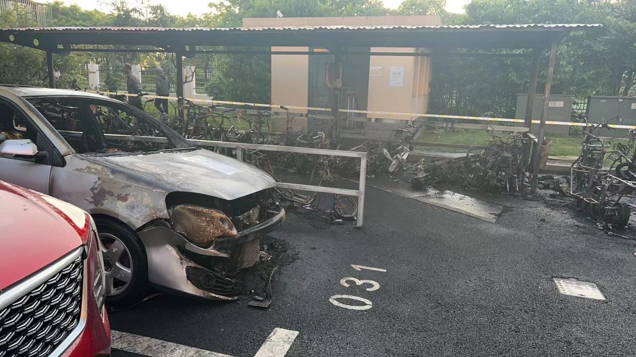 兩人火速趕到現(xiàn)場(chǎng),發(fā)現(xiàn)車棚內(nèi)多輛電動(dòng)自行車正在猛烈燃燒,火勢(shì)較大濃煙滾滾,同時(shí)還夾雜著噼噼啪啪的聲音,更為嚴(yán)重的是車棚旁還停放著5輛汽車,火勢(shì)如得不到及時(shí)有效控制,不但會(huì)造成巨大的財(cái)產(chǎn)損失,而且還會(huì)威脅到小區(qū)居民的生命安全。