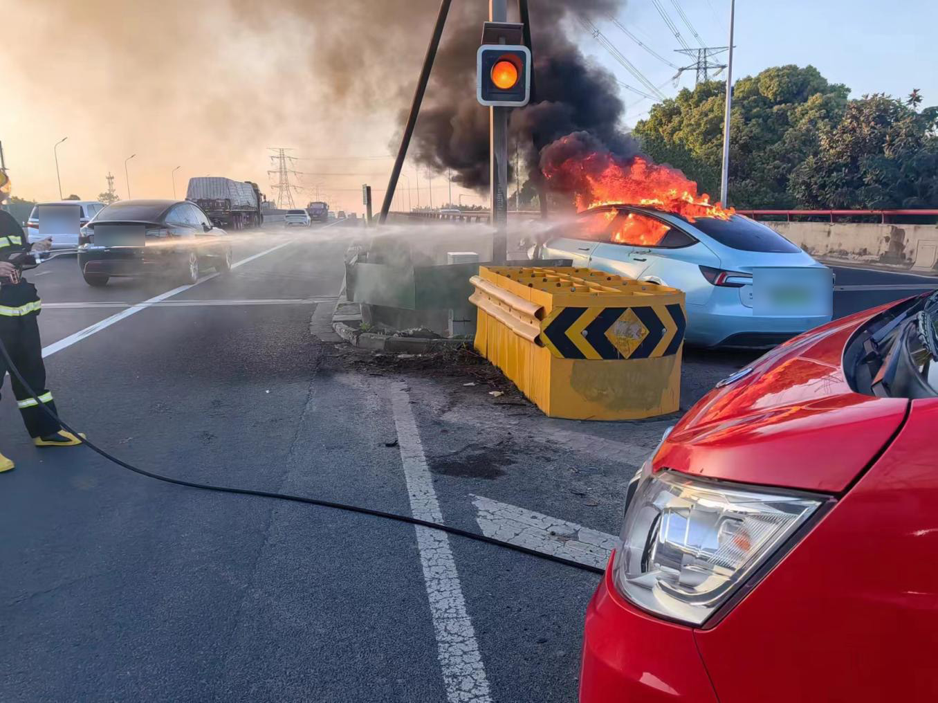當(dāng)日18:20,公司員工朱光海在微型消防站值班時(shí),突然聽到S2滬蘆高速康橋收費(fèi)站附近傳來一聲巨響。朱光海敏銳地察覺到異常情況后,便立即循著聲音的方向跑去,發(fā)現(xiàn)收費(fèi)站出口處一輛新能源轎車發(fā)生事故起火。