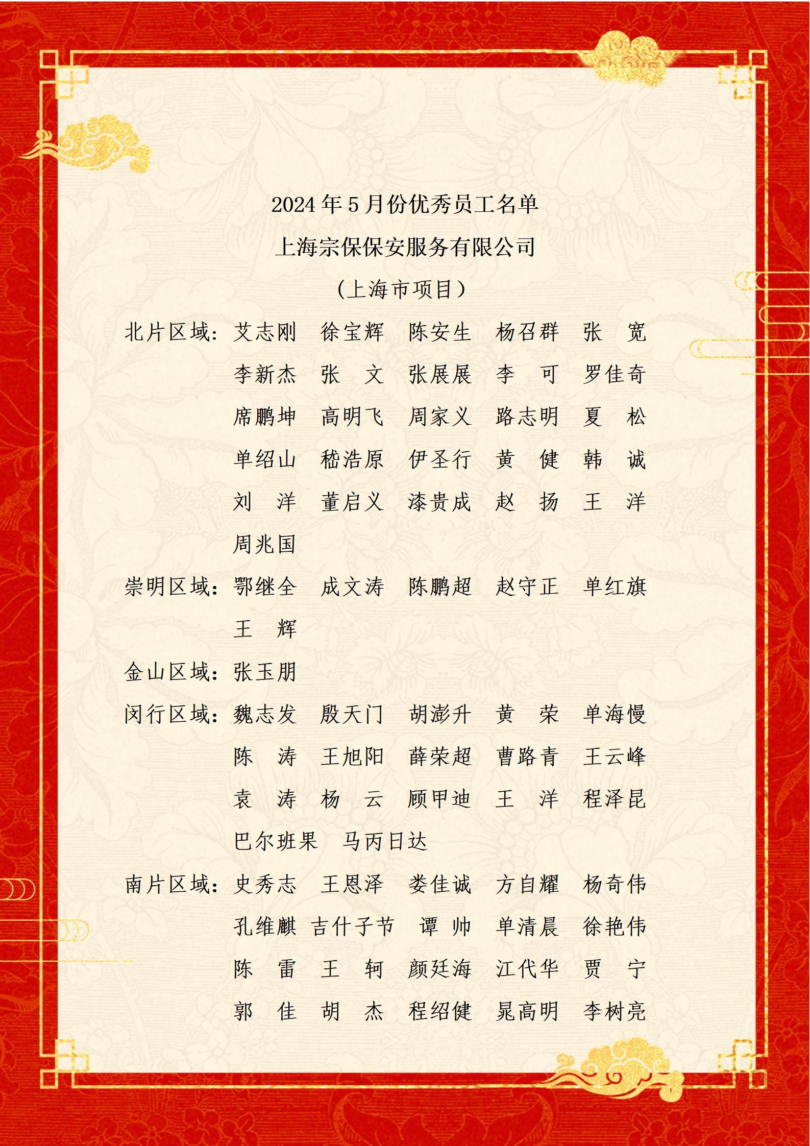 5月份,公司廣大員工根據(jù)甲方的任務(wù)要求,按照公司的部署安排,積極踐行公司“誠(chéng)信為本 服務(wù)至上”的經(jīng)營(yíng)理念,助力完成了奧運(yùn)會(huì)資格系列賽·上海、2024斯巴達(dá)勇士賽杭州站等十幾項(xiàng)大型活動(dòng)臨時(shí)保障任務(wù),全力配合甲方做好了城市管理輔助、治安巡邏聯(lián)防、物業(yè)服務(wù)保障、生態(tài)環(huán)境保護(hù)、高鐵線路巡防等工作。期間,涌現(xiàn)出了一批盡心履責(zé)、崗位建功、拾金不昧、熱心助人的優(yōu)秀員工和先進(jìn)典型。