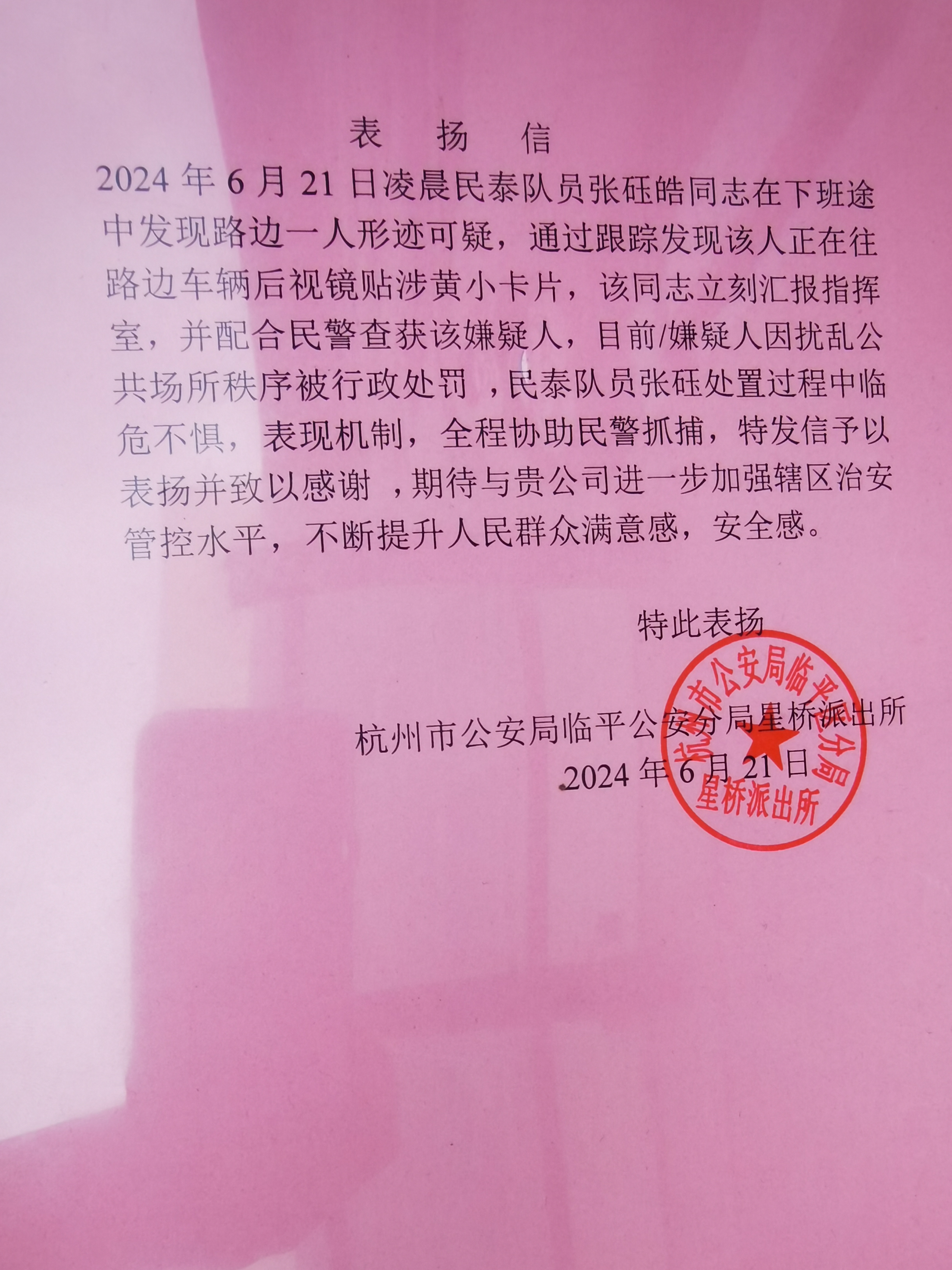 6月21日,浙江民泰公司駐杭州市臨平區(qū)公安分局星橋派出所輔助項目收到星橋派出所的一封表揚信,表揚公司員工張砡皓觀察入微警覺性高、時時牢記職責(zé),下班途中協(xié)助派出所抓獲涉黃廣告“黑手”的擔(dān)當作為精神。