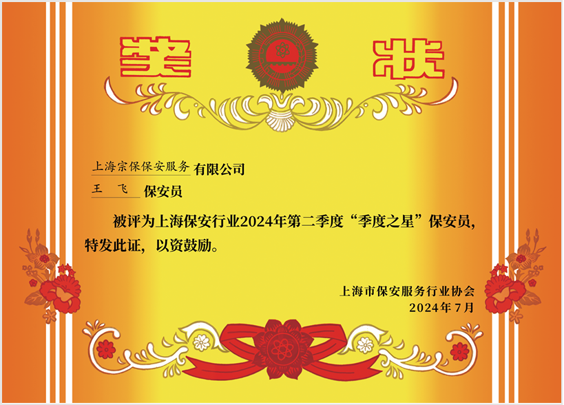 活動(dòng)當(dāng)日,上海市保安服務(wù)行業(yè)協(xié)會(huì)對(duì)榮獲2024年第二季度“季度之星”保安隊(duì)和保安員稱號(hào)的獲獎(jiǎng)代表進(jìn)行了表彰。宗保公司駐浦東新區(qū)臨港新城派出所項(xiàng)目保安隊(duì)榮獲“季度之星”保安隊(duì)榮譽(yù)稱號(hào),公司員工龔永剛、王飛榮獲“季度之星”保安員榮譽(yù)稱號(hào)。