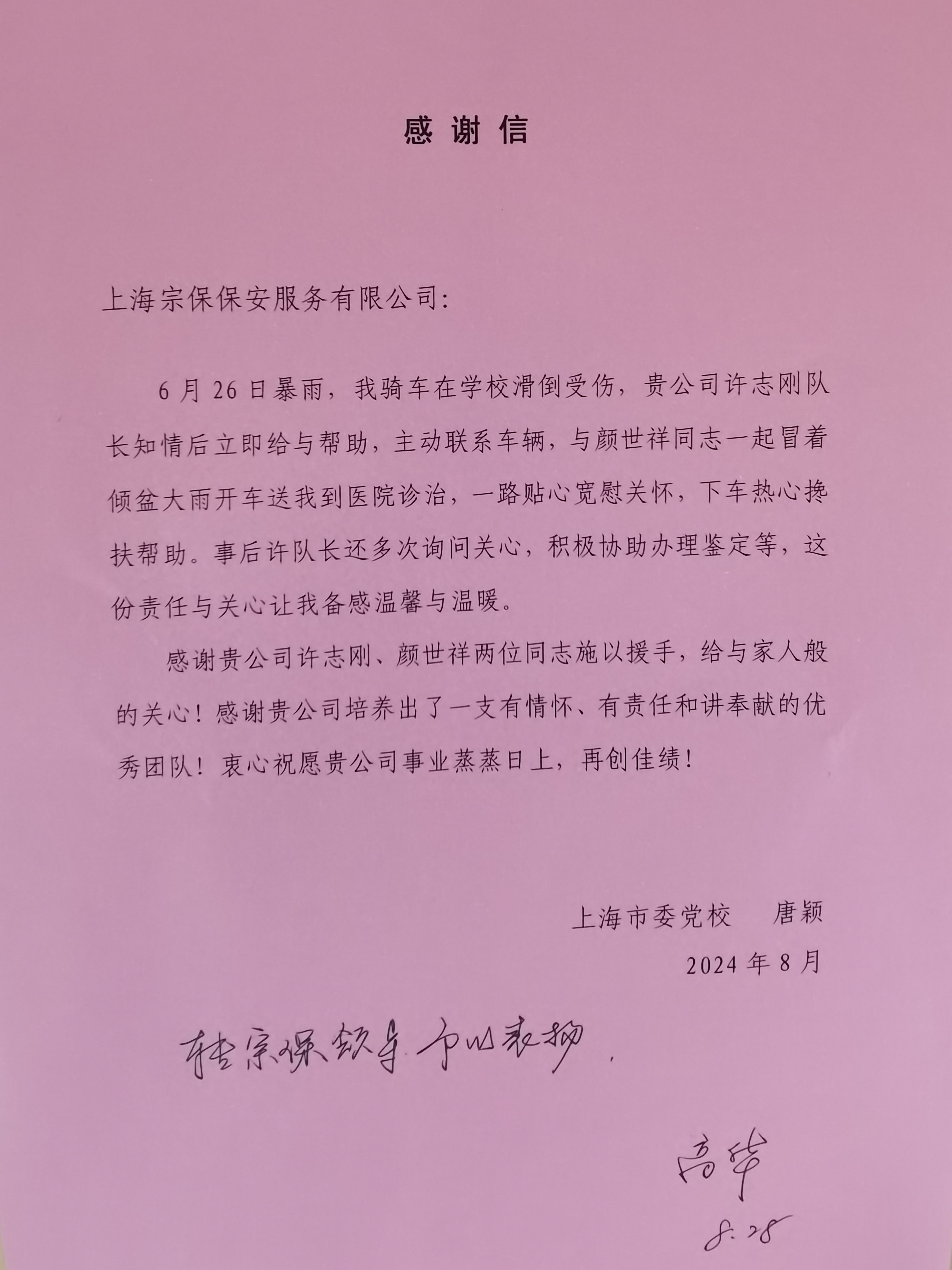 8月28日,宗保公司駐徐匯區(qū)市委黨校項(xiàng)目收到黨校老師唐女士送來的一封感謝信,感謝公司員工許志剛和顏世祥熱心助人的行為。