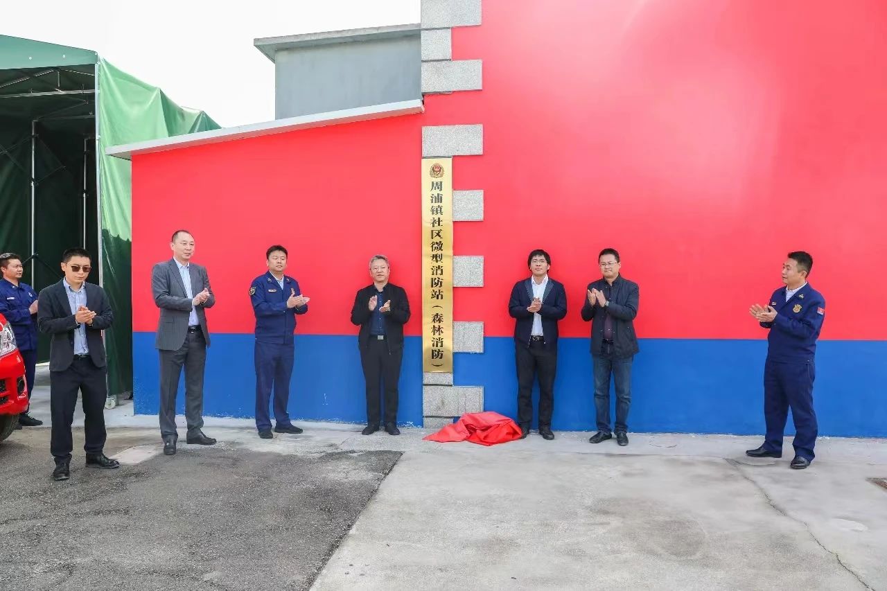 9:00綜合演練開始前,浦東新區(qū)消防救援支隊支隊長姜亦山、副支隊長吳新、惠南鎮(zhèn)黨委書記江臻宇、黨委副書記、鎮(zhèn)長楊揚共同為兩個微型消防站揭牌,隨后領(lǐng)導們觀看了微型消防站配置的消防車輛和滅火救援器材展示。