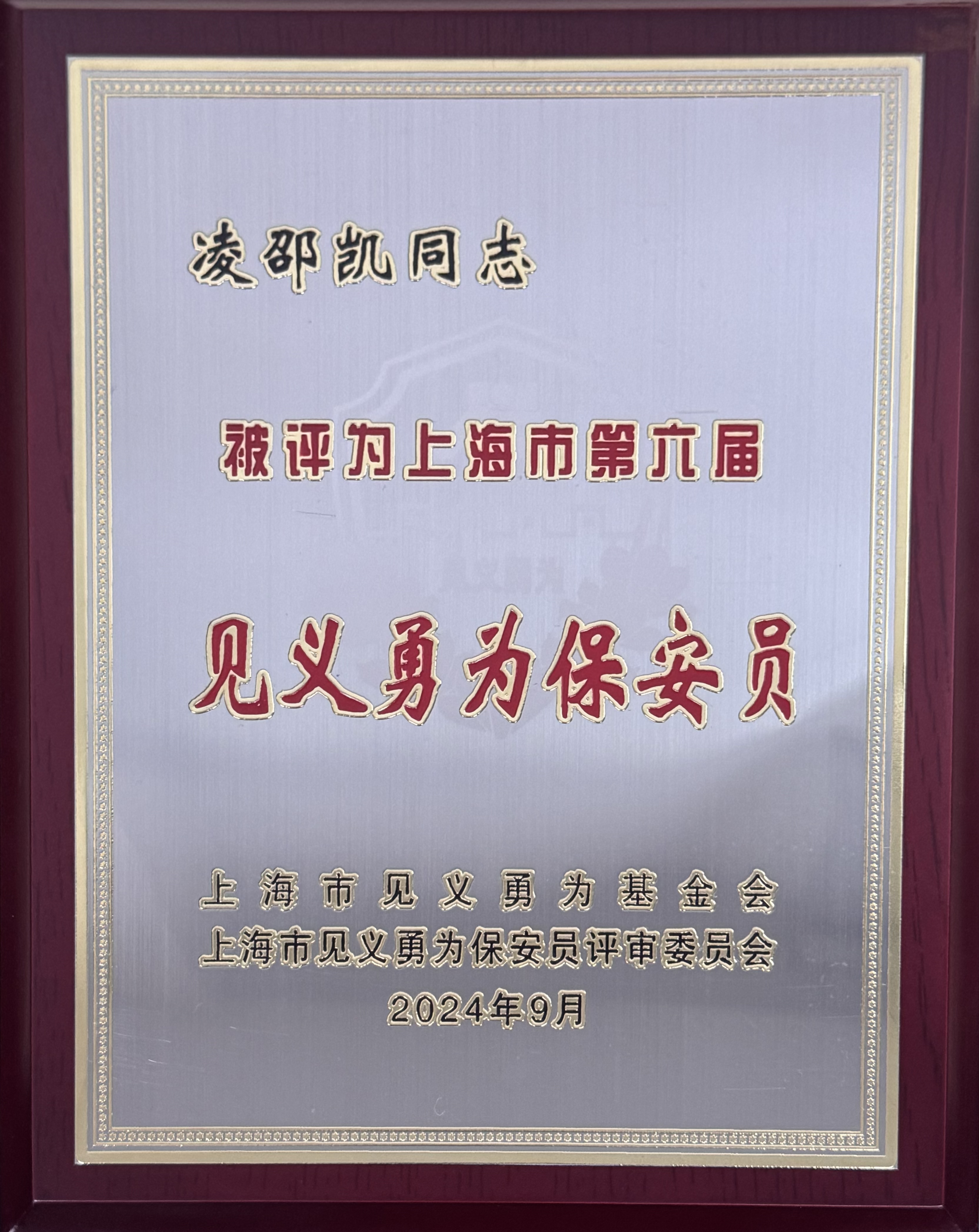 2024年9月27日,上海市見(jiàn)義勇為基金會(huì)在上海市司法局三樓會(huì)議室召開(kāi)2024年二三季度見(jiàn)義勇為先進(jìn)評(píng)選表彰發(fā)布會(huì)。會(huì)上,上海宗保保安服務(wù)有限公司員工管旭峰、凌邵凱、吳寶和鄧江峰被評(píng)為上海市第六屆“見(jiàn)義勇為保安員”。