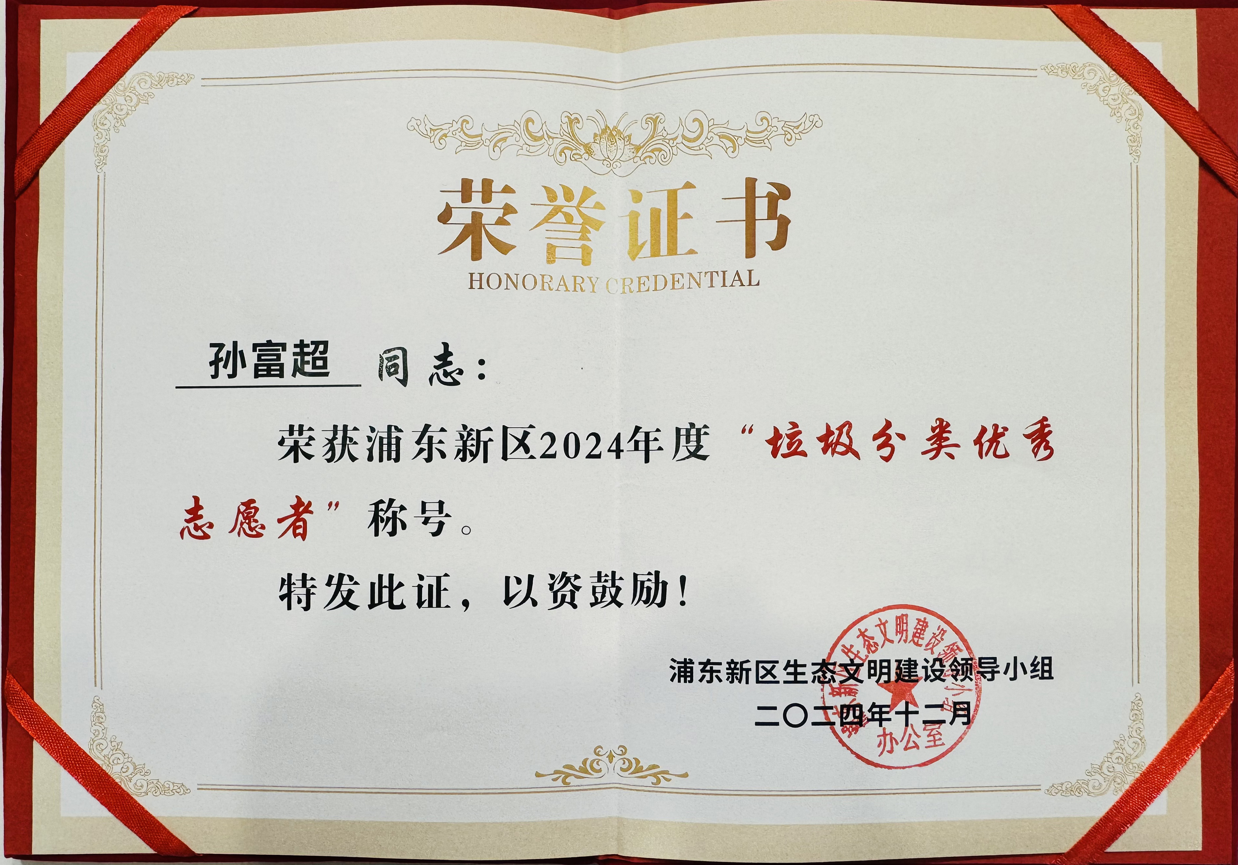 近日,宗保公司駐浦東新區(qū)陸家嘴街道社管辦小包垃圾巡查項目員工孫富超榮獲浦東新區(qū)2024年度 “垃圾分類優(yōu)秀志愿者”稱號。