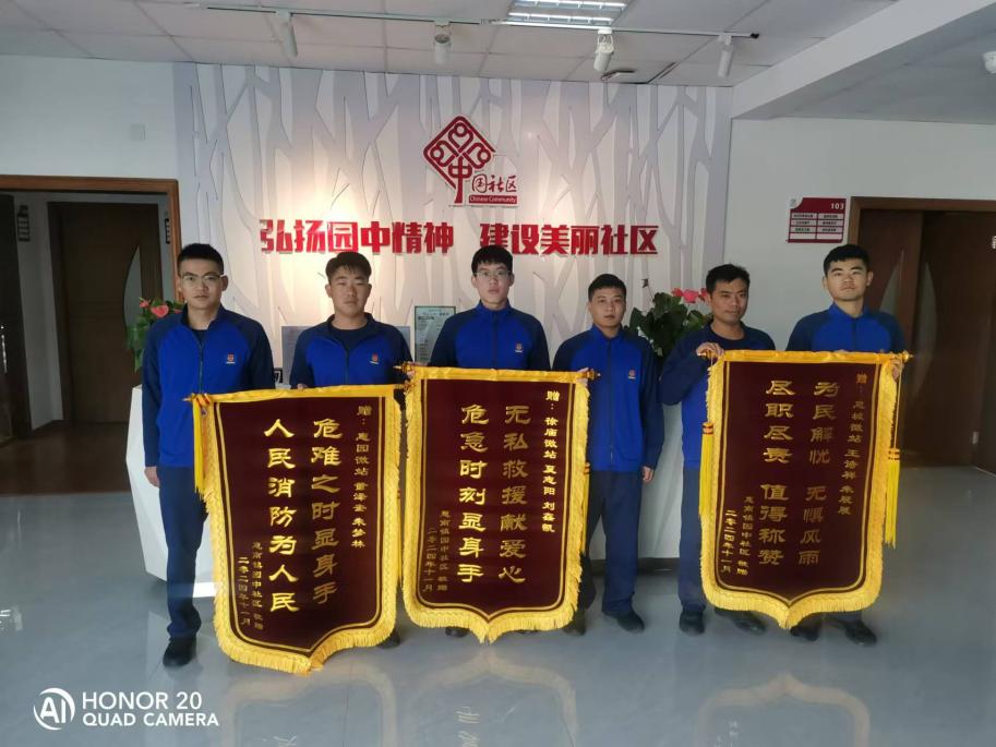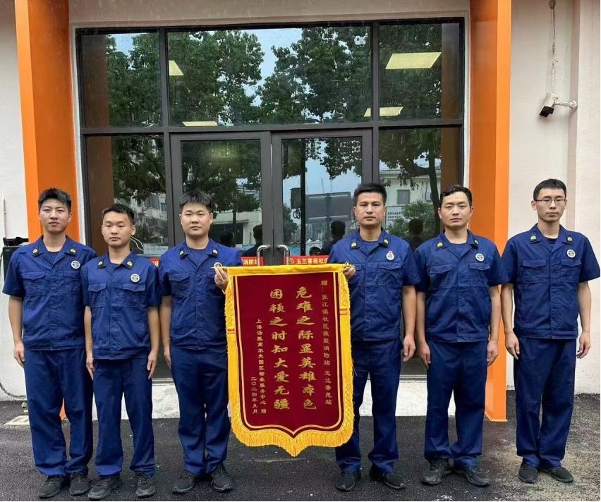 浦東新區(qū)張江鎮(zhèn)社區(qū)微型消防站、玉蘭香苑站獲贈繡有“危難之際顯英雄本色 困頓之時(shí)知大愛無疆”的錦旗