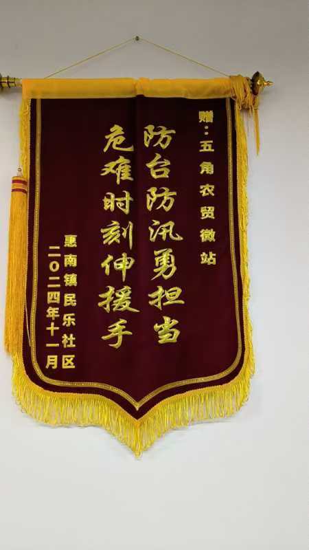 浦東新區(qū)惠南鎮(zhèn)五角農(nóng)貿(mào)微站獲贈繡有“防臺防汛勇?lián)?dāng) 危難時(shí)刻伸援手”的錦旗