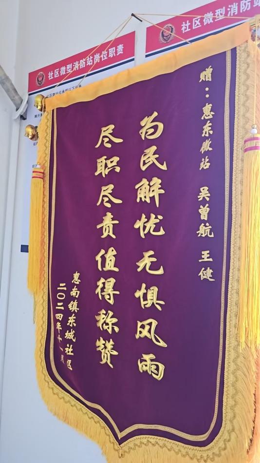 浦東新區(qū)惠南鎮(zhèn)勤奮微站獲贈繡有“危難之時(shí)顯身手 人民消防為人民”的錦旗